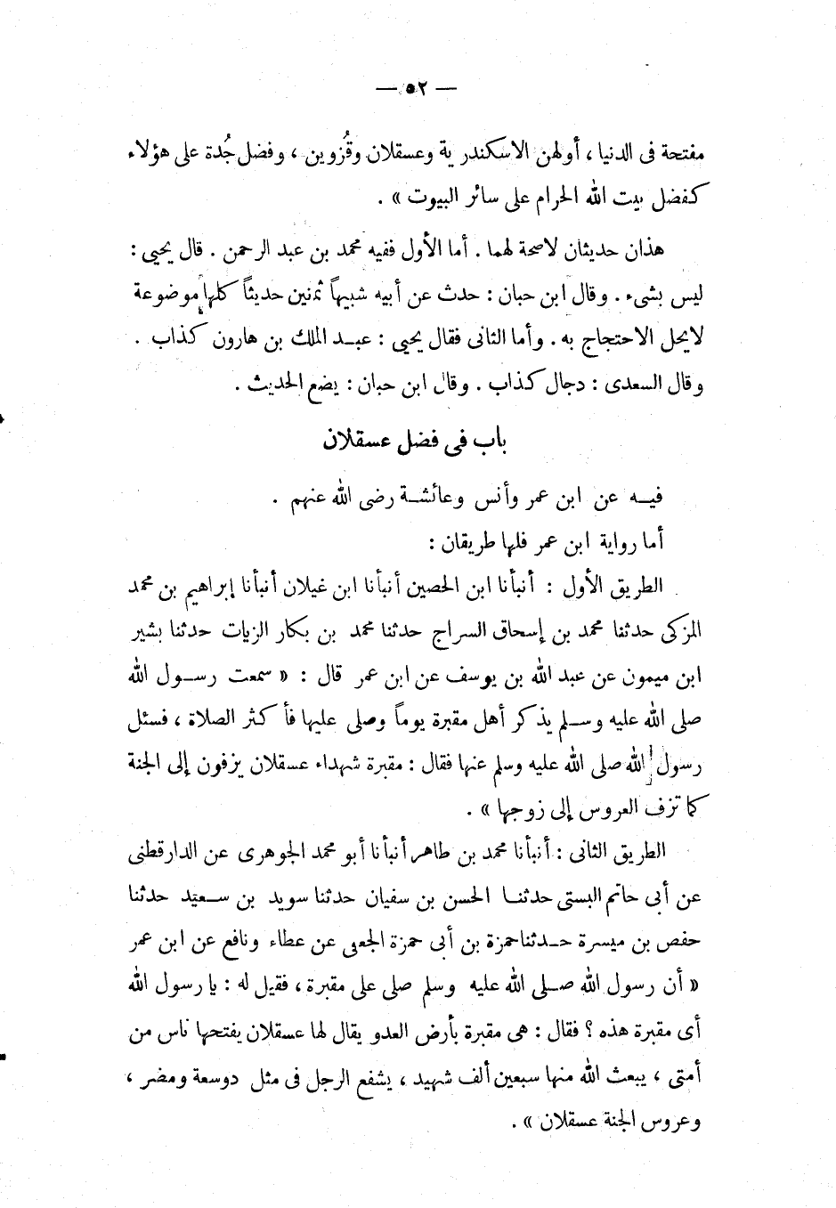 الطَّرِيق الثَّانِي: أَنْبَأَنَا مُحَمَّدُ بْنُ طَاهِر أَنْبَأَنَا أَبُو مُحَمَّدٍ الجوهرى عَن الدَّارقطني عَنْ أَبِي حَاتِمٍ الْبُسْتِيِّ حَدَّثَنَا الْحَسَنُ بْنُ سُفْيَانَ حَدَّثَنَا سُوَيْدُ بْنُ سَعِيدٍ حَدَّثَنَا حَفْصُ بْنُ مَيْسَرَةَ حَدَّثَنَا حَمْزَةُ بْنُ أَبِي حَمْزَةَ الْجُعْفِيُّ عَنْ عَطَاءٍ وَنَافِعٍ عَنِ ابْنِ عُمَرَ " أَنَّ رَسُولَ الله صَلَّى اللَّهُ عَلَيْهِ وَسَلَّمَ عَلَى مَقْبَرَةٍ، فَقِيلَ لَهُ: يَا رَسُولَ اللَّهِ أَيُّ مَقْبَرَةٍ هَذهِ؟ فَقَالَ: هِيَ مَقْبَرَةٌ بِأَرْضِ الْعَدُوِّ يُقَال لَهَا عسقلان يفتحا نَاسٌ مِنْ أُمَّتِي، يَبْعَثُ اللَّهُ مِنْهَا سَبْعِينَ أَلْفَ شَهِيدٍ، يَشْفَعُ الرَّجُلُ فِي مِثْلِ دَوْسَعَةَ وَمُضَرَ، وعروس الْجنَّة عسقلان ".