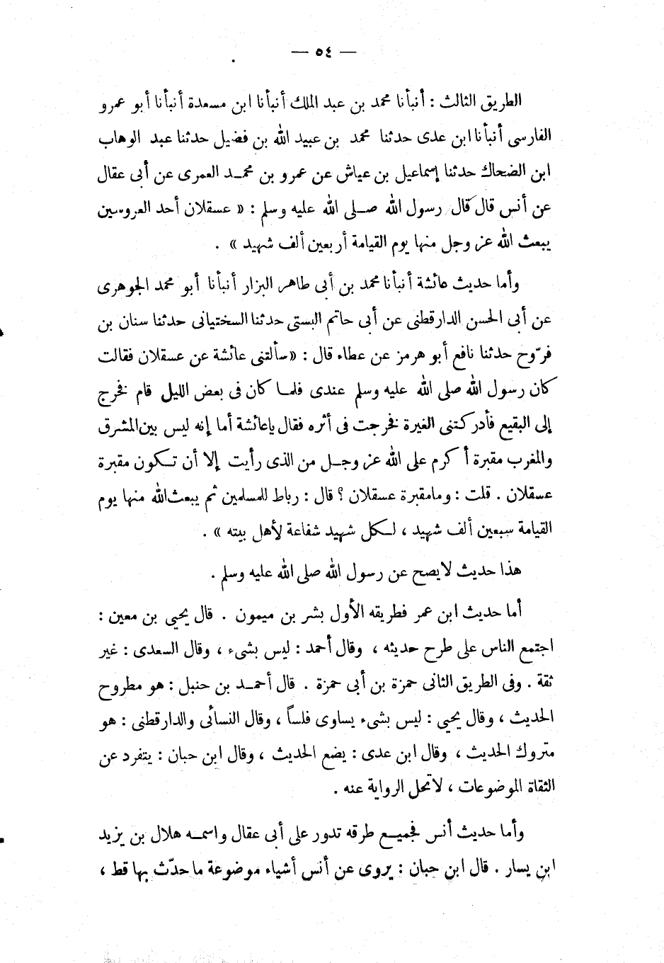الْفَارِسِيُّ أَنْبَأَنَا ابْنُ عَدِيٍّ حَدثنَا مُحَمَّد بن عبيد الله بْنِ فُضَيْلٍ حَدَّثَنَا عَبْدُ الْوَهَّابِ ابْن الضَّحَّاكِ حَدَّثَنَا إِسْمَاعِيلُ بْنُ عَيَّاشٍ عَنْ عَمْرِو بْنِ مُحَمَّدٍ الْعُمَرِيِّ عَنْ أَبِي عِقَالٍ عَنْ أَنَسٍ قَالَ قَالَ رَسُول الله صَلَّى اللَّهُ عَلَيْهِ وَسَلَّمَ: " عَسْقَلانُ أَحَدُ العروسين يبْعَث الله عزوجل مِنْهَا يَوْمَ الْقِيَامَةِ أَرْبَعِينَ أَلْفَ شَهِيد ".