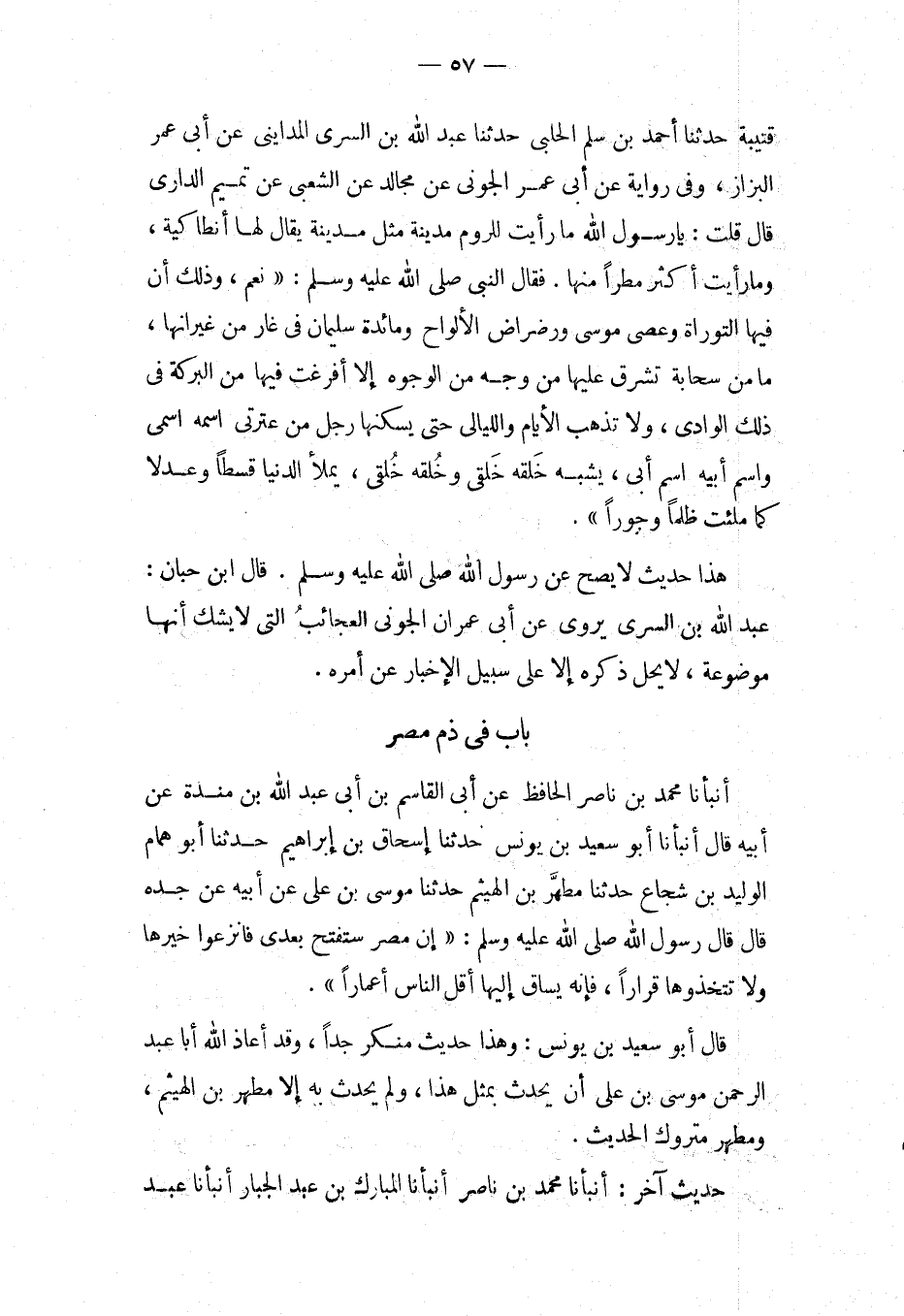 قُتَيْبَةَ حَدَّثَنَا أَحْمَدُ بْنُ سَلْمٍ الْحلَبِي حَدثنَا عبد الله بْنُ السَّرِيّ الْمَدَايِنِيُّ عَنْ أَبِي عُمَرَ الْبَزَّازِ، وَفِي رِوَايَةٍ عَنْ أَبِي عُمَرَ الْجَوْنِيِّ عَنْ مُجَالِدٍ عَنِ الشَّعْبِيِّ عَنْ تَمِيمٍ الدَّارِيِّ قَالَ قُلْتُ: يَا رَسُولَ اللَّهِ مَا رَأَيْتُ لِلرُّومِ مَدِينَةً مِثْلَ مَدِينَةٍ يُقَالُ لَهَا أَنْطَاكِيَّةُ، وَمَا رَأَيْتُ أَكْثَرَ مَطَرًا مِنْهَا.