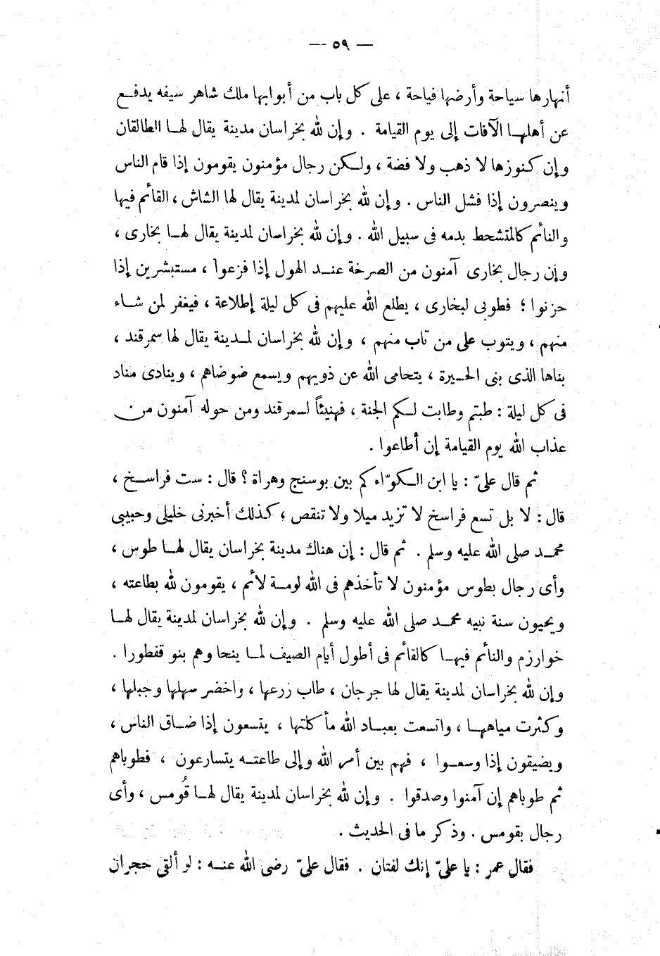 وَإِنَّ لِلَّهِ بِخُرَاسَانَ لَمِديَنَةً يُقَالُ لَهَا بُخَارَى، وَإِنَّ رَجَالَ بُخَارَى آمِنُونَ مِنَ الصَّرْخَةِ عِنْدَ الْهَوْلِ إِذَا فَزِعُوا، مُسْتَبْشِرِينَ إِذَا حَزِنُوا، فَطُوبَى لِبُخَارَى، يَطَّلِعُ اللَّهُ عَلَيْهِمْ فِي كُلِّ لَيْلَةٍ إِطَّلاعَةً، فَيَغْفِرُ لِمَنْ شَاءَ مِنْهُمْ، وَيَتُوبُ عَلَى مَنْ تَابَ مِنْهُمْ، وَإِنَّ لِلَّهِ بِخُرَاسَانَ لَمَدِينَةً يُقَالَ لَهَا سَمَرْقَنْدُ، بَنَاهَا الَّذِي بَنَى الْحِيرَةَ، يَتَحَامَى اللَّهُ عَنْ ذويهم وَيسمع ضوضاهم، وَيُنَادِي مُنَادٍ فِي كُلِّ لَيْلَةٍ: طِبْتُمْ وَطَابَتْ لَكُمُ الْجَنَّةُ فَهَنِيئًا لِسَمَرْقَنْدَ وَمَنْ حَوْلَهُ آمِنُونَ مِنْ عَذَابِ اللَّهِ يَوْمَ الْقِيَامَةِ إِنْ أطاعوا.