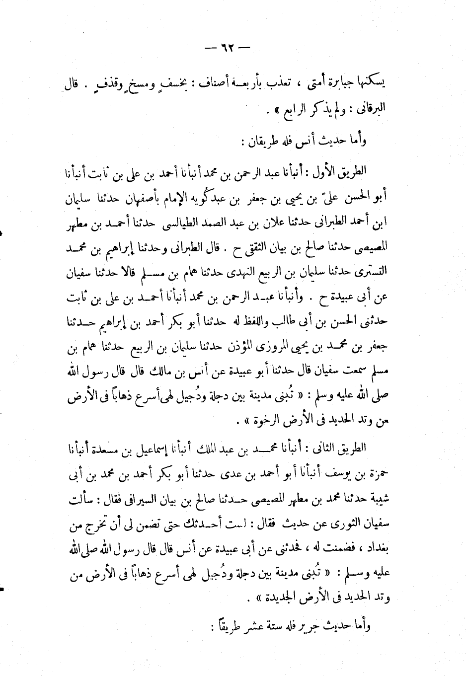 وَأما حَدِيث أنس فَلهُ طَرِيقَانِ: الطَّرِيق الأول: أَنبأَنَا عبد الرحمن بْنُ مُحَمَّدٍ أَنْبَأَنَا أَحْمَدُ بْنُ عَلِيِّ بْنِ ثَابِتٍ أَنْبَأَنَا أَبُو الْحَسَنِ عَلِيُّ بْنُ يَحْيَى بْنِ جَعْفَرِ بْنِ عَبْدِ كُوَيْهٍ الإِمَامُ بأصفهان حَدثنَا سُلَيْمَان ابْن أَحْمَدَ الطَّبَرَانِيُّ حَدَّثَنَا عَلانُ بْنُ عَبْدِ الصَّمَدِ الطَّيَالِسِيُّ حَدَّثَنَا أَحْمَدُ بْنُ مُطَهَّرٍ الْمِصِّيصِيُّ حَدَّثَنَا صَالِحُ بْنُ بَيَانٍ الثَّقَفِيُّ ح.