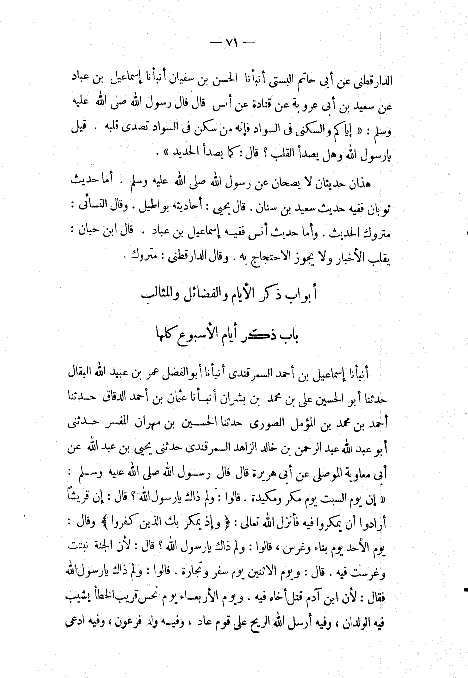 أَبْوَاب ذكر الايام والفضائل والمثالب بَاب ذكر أَيَّام الاسبوع كلهَا أَنبأَنَا إِسْمَاعِيل بن أَحْمد السَّمرقَنْدِي أَنْبَأَنَا أَبُو الْفَضْلِ عُمَرُ بْنُ عبيد الله الْبَقَّالُ حَدَّثَنَا أَبُو الْحُسَيْنِ عَلِيُّ بْنُ مُحَمَّدِ بْنِ بِشْرَانَ أَنْبَأَنَا عُثْمَانُ بْنُ أَحْمَدَ الدَّقَّاقُ حَدَّثَنَا أَحْمَدُ بْنُ مُحَمَّدِ بْنِ الْمُؤَمَّلِ الصُّورِيُّ حَدَّثَنَا الْحُسَيْنُ بْنُ مِهْرَانَ الْمُفَسِّرُ حَدَّثَنِي أَبُو عَبْدِ اللَّهِ عبد الرحمن بْنُ خَالِدٍ الزَّاهِدُ السَّمَرْقَنْدِيُّ حَدَّثَنِي يحيى بن عبد الله عَنْ أَبِي مُعَاوِيَةَ الْمَوْصِلِيِّ عَنْ أَبِي هُرَيْرَةَ قَالَ قَالَ رَسُولُ الله صَلَّى اللَّهُ عَلَيْهِ وَسَلَّمَ: " إِن يَوْم السبت يَوْم مكرو مكيدة.
