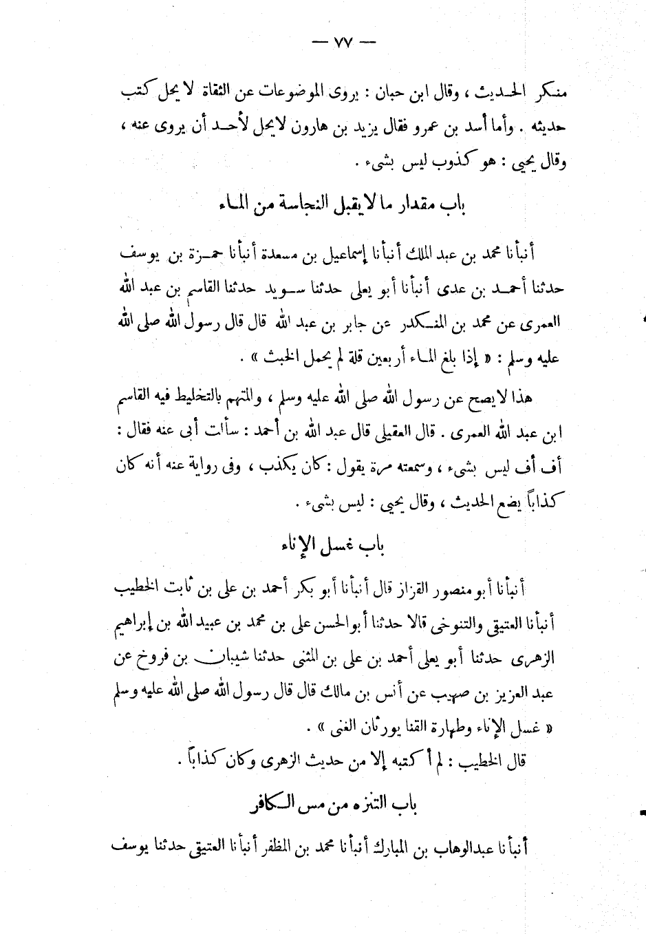 بَاب مِقْدَار مَا لَا يقبل النَّجَاسَة من المَاء أَنبأَنَا مُحَمَّد بن عبد الملك أَنْبَأَنَا إِسْمَاعِيلُ بْنُ مَسْعَدَةَ أَنْبَأَنَا حَمْزَةُ بْنُ يُوسُفَ حَدَّثَنَا أَحْمَدُ بْنُ عَدِيٍّ أَنْبَأَنَا أَبُو يَعْلَى حَدَّثَنَا سُوَيْدٌ حَدَّثَنَا الْقَاسِمُ بْنُ عبد الله الْعُمَرِيُّ عَنْ مُحَمَّدِ بْنِ الْمُنْكَدِرِ عَن جَابر بن عبد الله قَالَ قَالَ رَسُول الله صَلَّى اللَّهُ عَلَيْهِ وَسَلَّمَ: " إِذَا بَلَغَ الْمَاءُ أَرْبَعِينَ قُلَّةً لَمْ يَحْمِلِ الْخُبْثَ ".