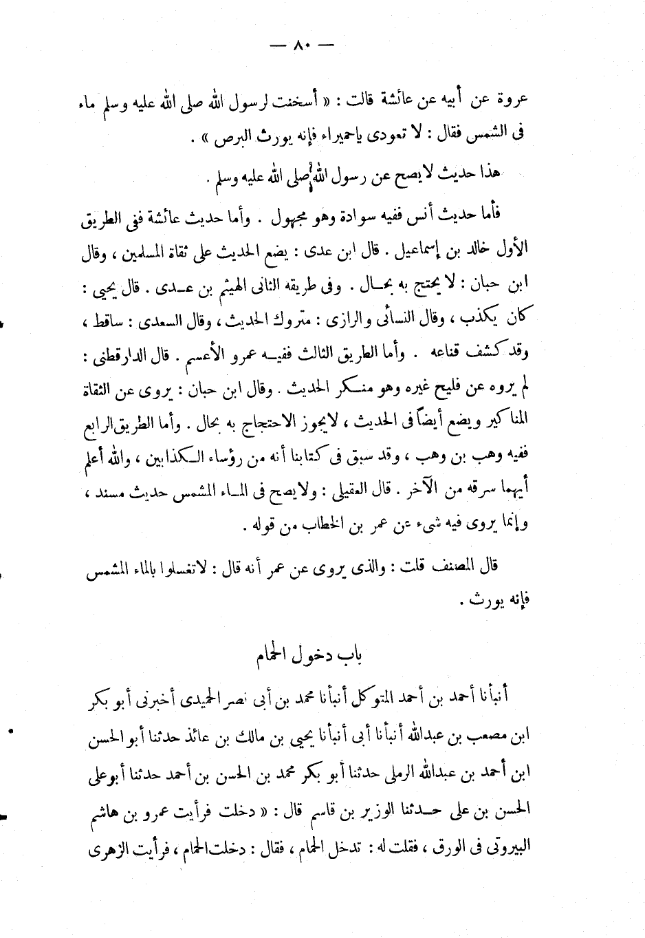عُرْوَةَ عَنْ أَبِيهِ عَنْ عَائِشَةَ قَالَتْ: " أَسْخَنْتُ لِرَسُولِ اللَّه صَلَّى اللَّهُ عَلَيْهِ وَسَلَّمَ مَاءً فِي الشَّمْسِ فَقَالَ: لَا تَعُودِي يَا حُمَيْرَاءُ فَإِنَّهُ يُورِثُ الْبَرَصَ ".