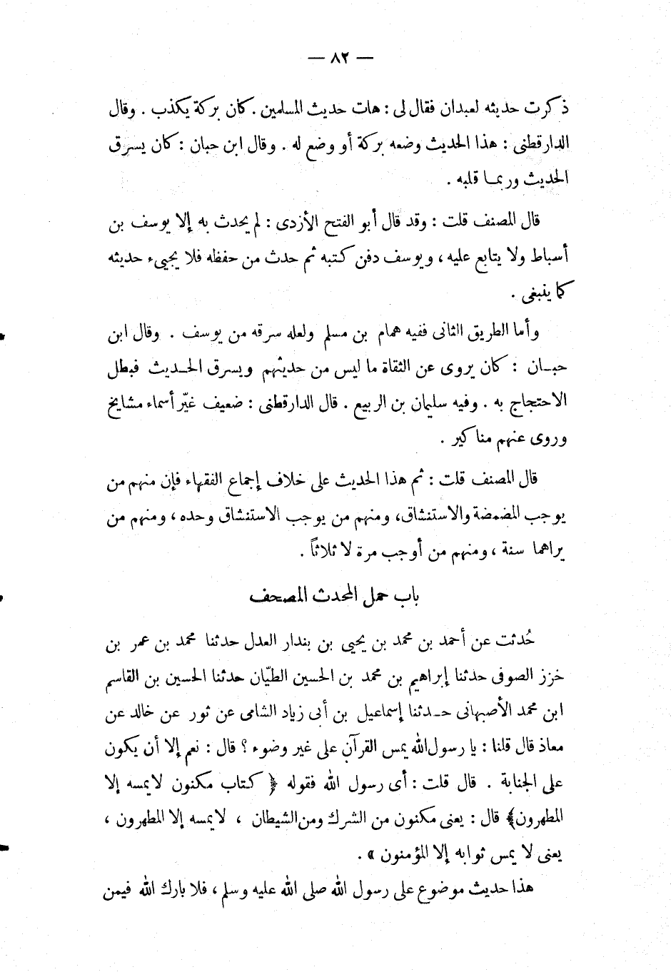 بَاب حمل الْمُحدث الْمُصحف حدثت عَنْ أَحْمَدَ بْنِ مُحَمَّدِ بْنِ يَحْيَى بْنِ بُنْدَارٍ الْعَدْلُ حَدَّثَنَا مُحَمَّدُ بْنُ عُمَرَ بْنِ خُزَزَ الصُّوفِيُّ حَدَّثَنَا إِبْرَاهِيمُ بْنُ مُحَمَّدِ بْنِ الْحُسَيْنِ الطَّيَّانُ حَدَّثَنَا الْحُسَيْنُ بن الْقَاسِم ابْن مُحَمَّدٍ الأَصْبَهَانِيُّ حَدَّثَنَا إِسْمَاعِيلُ بْنُ أَبِي زِيَادٍ الشَّامِيُّ عَنْ ثَوْرٍ عَنْ خَالِدٍ عَنْ مُعَاذٍ قَالَ قُلْنَا: يَا رَسُولَ اللَّهِ يُمَسُّ الْقُرْآنُ عَلَى غَيْرِ وُضُوءٍ؟ قَالَ: نَعَمْ إِلا أَنْ يَكُونَ عَلَى الْجَنَابَةِ.