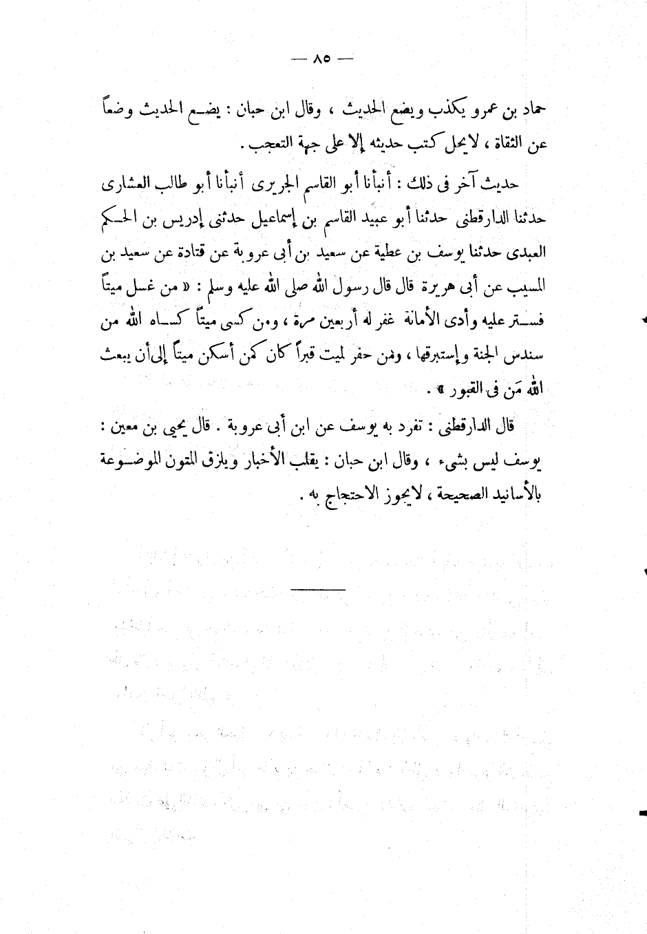 حَدِيث آخر فِي ذَلِكَ: أَنْبَأَنَا أَبُو الْقَاسِمِ الْجُرَيْرِيُّ أَنْبَأَنَا أَبُو طَالِبٍ الْعُشَارِيُّ حَدَّثَنَا الدَّارَقُطْنِيُّ حَدَّثَنَا أَبُو عُبَيْدٍ الْقَاسِمُ بْنُ إِسْمَاعِيلَ حَدَّثَنِي إِدْرِيسُ بْنُ الْحَكَمِ الْعَبْدِيُّ حَدَّثَنَا يُوسُفُ بْنُ عَطِيَّةَ عَنْ سَعِيدِ بْنِ أَبِي عَرُوبَةَ عَنْ قَتَادَةَ عَنْ سعيد بن الْمسيب عَن أبي هُرَيْرَةَ قَالَ قَالَ رَسُولُ اللَّهِ صَلَّى اللَّهُ عَلَيْهِ وَسَلَّمَ: " من غَسَّلَ مَيِّتًا فَسَتَرَ عَلَيْهِ وَأَدَّى الأَمَانَةَ غُفِرَ لَهُ أَرْبَعِينَ مَرَّةً، وَمَنْ كَسَى مَيِّتًا كَسَاهُ اللَّهُ مِنْ سُنْدُسِ الْجَنَّةِ وَإِسْتَبَرَقِهَا، وَمَنْ حَفَرَ لِمَيِّتٍ قَبْرًا كَانَ كَمَنْ أَسْكَنَ مَيِّتًا إِلَى أَنْ يَبْعَثَ اللَّهُ مَنْ فِي الْقُبُورِ ".