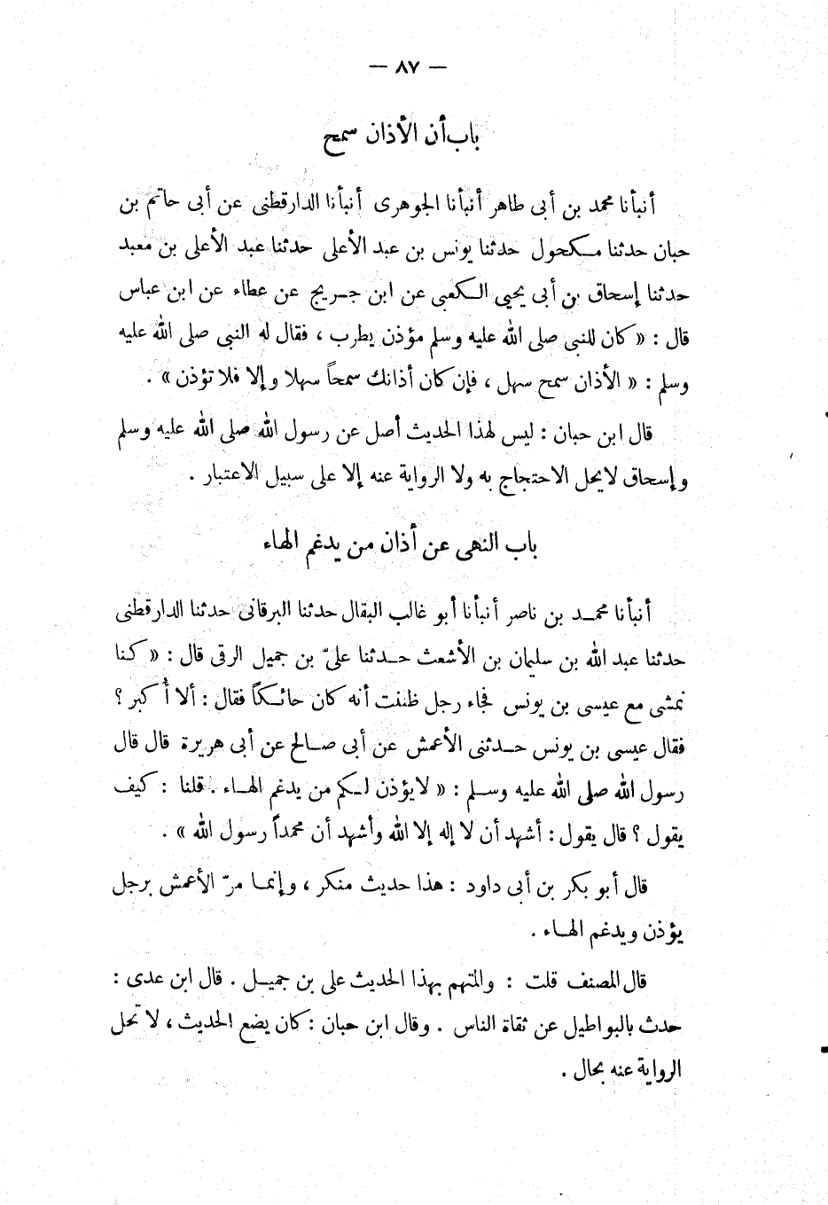 بَاب النَّهْي عَنْ أَذَان من يدغم الْهَاء أَنْبَأَنَا مُحَمَّدُ بْنُ نَاصِرٍ أَنْبَأَنَا أَبُو غَالِبٍ الْبَقَّالُ حَدَّثَنَا الْبَرْقَانِيُّ حَدثنَا الدَّارَقُطْنِيّ حَدثنَا عبد الله بْنُ سُلَيْمَانَ بْنِ الأَشْعَثِ حَدَّثَنَا عَلِيُّ بْنُ جَمِيلٍ الرَّقِّيُّ قَالَ: " كُنَّا نَمْشِي مَعَ عِيسَى بْنِ يُونُسَ فَجَاءَ رَجُلٌ ظَنَنْتُ أَنَّهُ كَانَ حَائِكًا فَقَالَ: أَلا أُكَبِّرُ؟ فَقَالَ عِيسَى بْنُ يُونُسَ حَدَّثَنِي الأَعْمَشِ عَنْ أَبِي صَالِحٍ عَنْ أَبِي هُرَيْرَةَ قَالَ قَالَ رَسُولُ الله صَلَّى اللَّهُ عَلَيْهِ وَسَلَّمَ: " لَا يُؤَذِّنُ لَكُمْ مَنْ يُدْغِمُ الْهَاءَ.