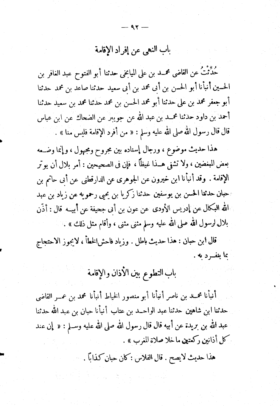 بَاب النهى عَن إِفْرَاد الاقامة حدثت عَنْ الْقَاضِي مُحَمَّدِ بْنِ عَلِيٍّ الْمَيَانِجِيِّ حَدَّثَنَا أَبُو الْفُتُوحِ عَبْدُ الْغَافِرِ بْنُ الْحُسَيْنِ أَنْبَأَنَا أَبُو الْحَسَنِ بْنُ أَبِي مُحَمَّدِ بْنِ أَبِي سَعِيدٍ حَدَّثَنَا صَاعِدُ بْنُ مُحَمَّدٍ حَدَّثَنَا