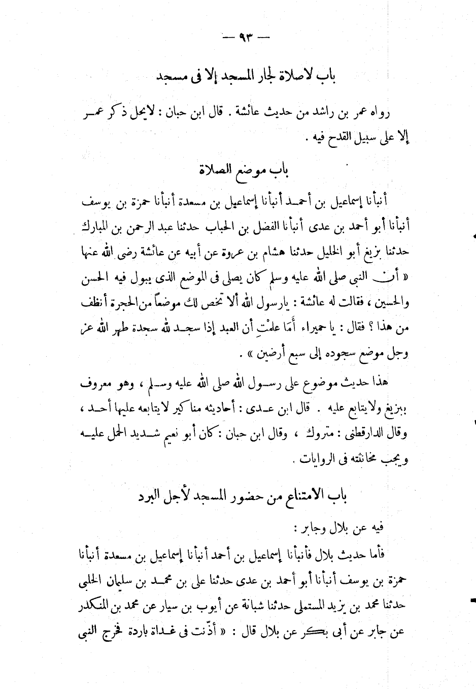 أَنبأَنَا إِسْمَاعِيل بن أَحْمد أَنبأَنَا إِسْمَاعِيلُ بْنُ مَسْعَدَةَ أَنْبَأَنَا حَمْزَةُ بْنُ يُوسُفَ أَنْبَأَنَا أَبُو أَحْمَدَ بْنُ عَدِيٍّ أَنْبَأَنَا الْفَضْلُ بْنُ الْحباب حَدثنَا عبد الرحمن بْنُ الْمُبَارَكِ حَدَّثَنَا بَزِيغٌ أَبُو الْخَلِيلِ حَدَّثَنَا هِشَامُ بْنُ عُرْوَةَ عَنْ أَبِيهِ عَنْ عَائِشَةَ رَضِيَ اللَّهُ عَنْهَا " أَنَّ النَّبِيَّ صَلَّى اللَّهُ عَلَيْهِ وَسَلَّمَ كَانَ يُصَلِّي فِي الْمَوْضِعِ الَّذِي يَبُولُ فِيهِ الْحَسَنُ وَالْحُسَيْنُ، فَقَالَتْ لَهُ عَائِشَةُ: يَا رَسُولَ اللَّهِ أَلا تَخُصُّ لَكَ مَوْضِعًا مِنَ الْحُجْرَةِ أَنْظَفَ مِنْ هَذَا؟ فَقَالَ: يَا حُمَيْرَاءُ أَمَا عَلِمْتِ أَنَّ الْعَبْدَ إِذَا سَجَدَ لِلَّهِ سَجْدَةً طَهَّرَ اللَّهُ عَزَّ وَجَلَّ مَوْضِعَ سُجُودِهِ إِلَى سَبْعِ أَرَضِينَ ".