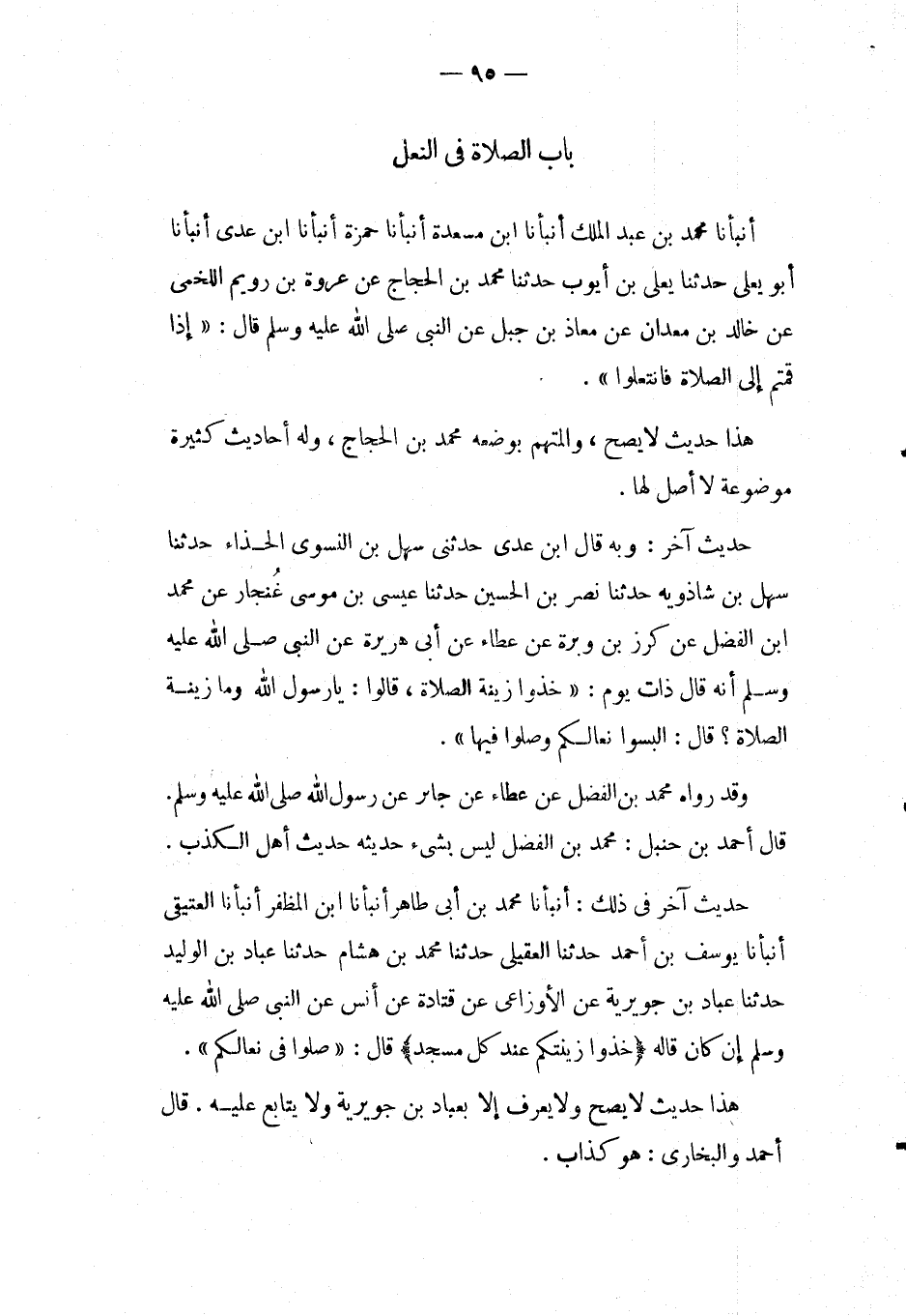 بَاب الصَّلَاة فِي النَّعْل أَنبأَنَا مُحَمَّد بن عبد الملك أَنْبَأَنَا ابْنُ مَسْعَدَةَ أَنْبَأَنَا حَمْزَةُ أَنْبَأَنَا ابْنُ عَدِيٍّ أَنْبَأَنَا أَبُو يَعْلَى حَدَّثَنَا يَعْلَى بْنُ أَيُّوبَ حَدَّثَنَا مُحَمَّدُ بْنُ الْحَجَّاجِ عَنْ عُرْوَةَ بْنِ رُوَيْمٍ اللَّخْمِيِّ عَنْ خَالِدِ بْنِ مَعْدَانَ عَنْ مُعَاذِ بْنِ جَبَلٍ عَنِ النَّبِيِّ صَلَّى اللَّهُ عَلَيْهِ وَسَلَّمَ قَالَ: " إِذا