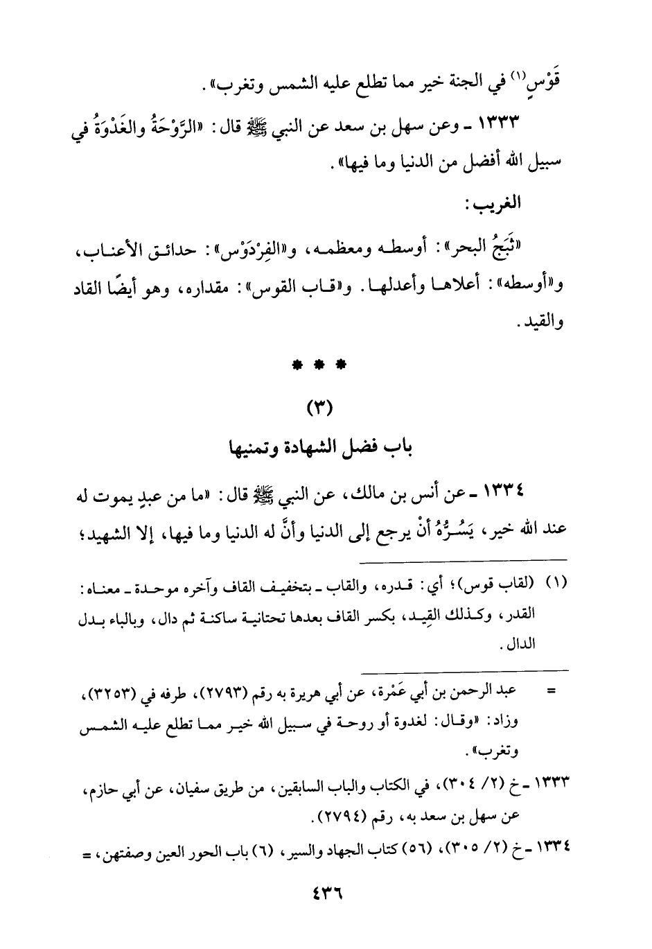 1333 - وعن سهل بن سعد عن النبي -صلى اللَّه عليه وسلم- قال: "الرَّوْحَةُ والغَدْوَةُ في سبيل اللَّه أفضل من الدنيا وما فيها".