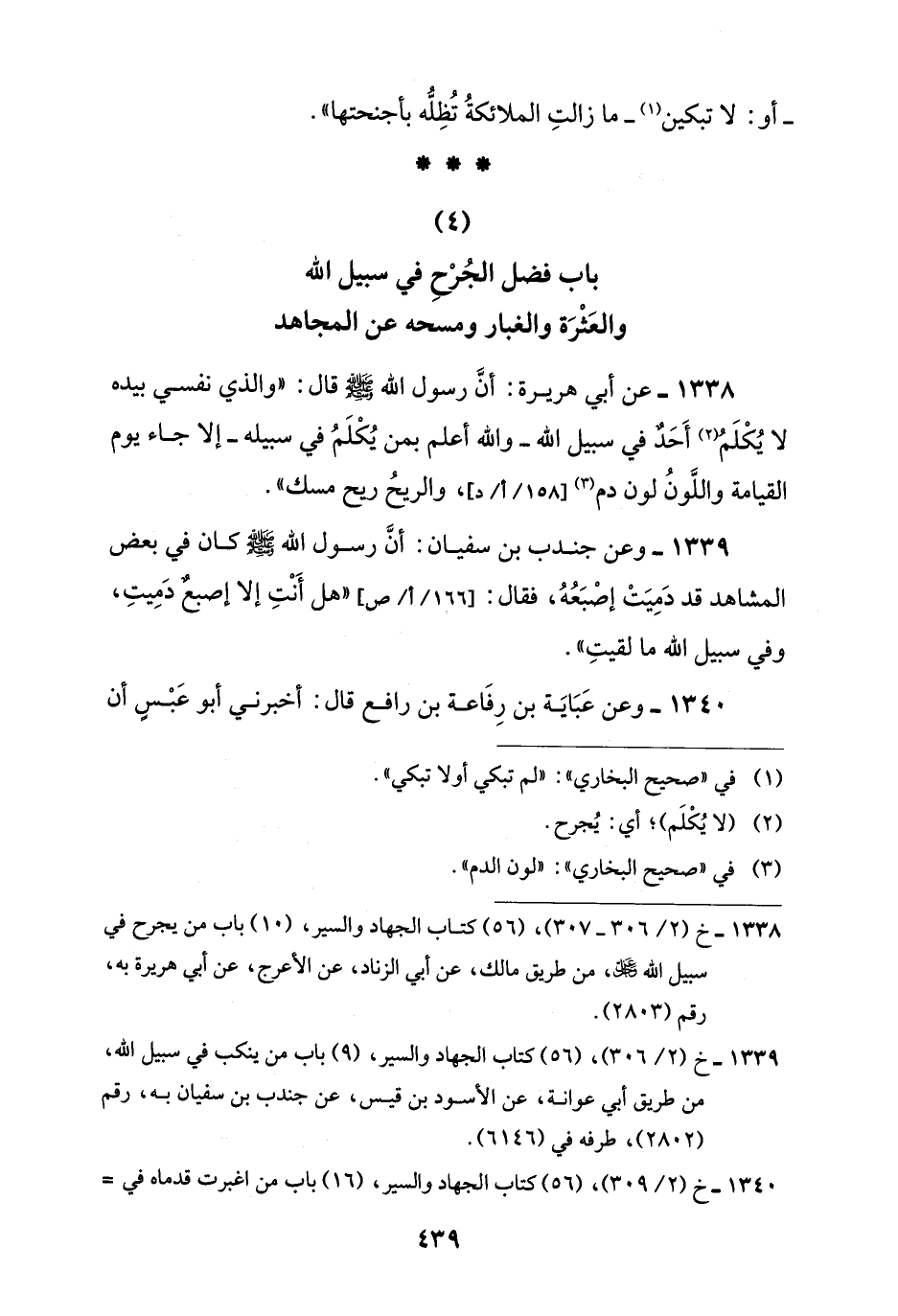 1338 - خ (2/ 306 - 307)، (56) كتاب الجهاد والسير، (10) باب من يجرح في سبيل اللَّه -عَزَّ وَجَلَّ-، من طريق مالك، عن أبي الزناد، عن الأعرج، عن أبي هريرة به، رقم (2803).