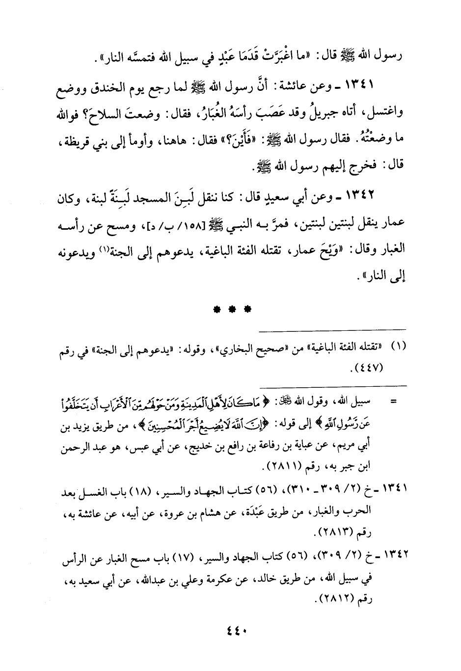1342 - خ (2/ 309)، (56) كتاب الجهاد والسير، (17) باب مسح الغبار عن الرأس في سبيل اللَّه، من طريق خالد، عن عكرمة وعلي بن عبد اللَّه، عن أبي سعيد به، رقم (2812).