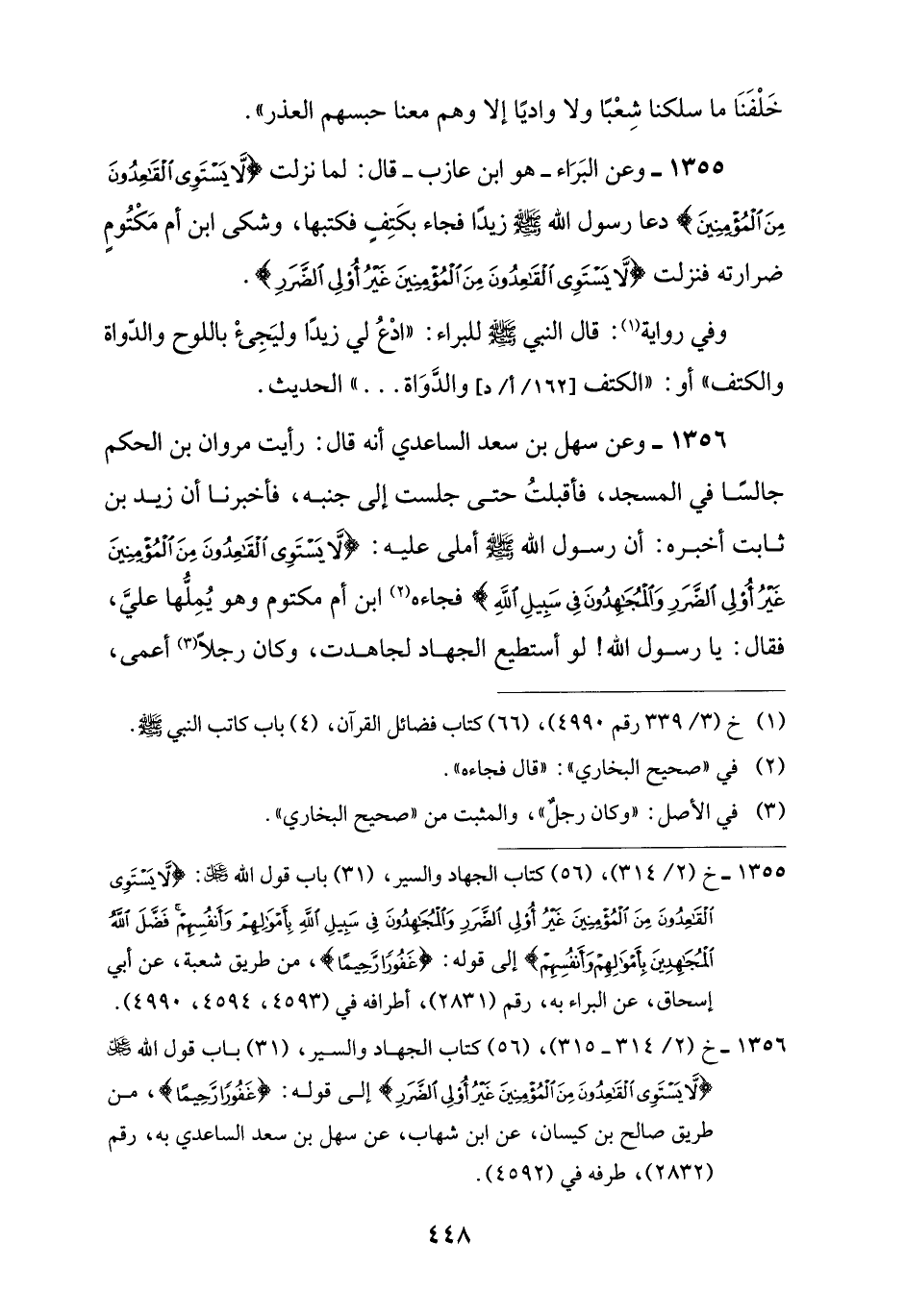 1355 - وعن البَرَاء -هو ابن عازب- قال: لما نزلت {لَا يَسْتَوِي الْقَاعِدُونَ مِنَ الْمُؤْمِنِينَ} دعا رسول اللَّه -صلى اللَّه عليه وسلم- زيدًا فجاء بكَتِفٍ فكتبها، وشكى ابن أم مَكْتُومٍ ضرارته فنزلت {لَا يَسْتَوِي الْقَاعِدُونَ مِنَ الْمُؤْمِنِينَ غَيْرُ أُولِي الضَّرَرِ}.
