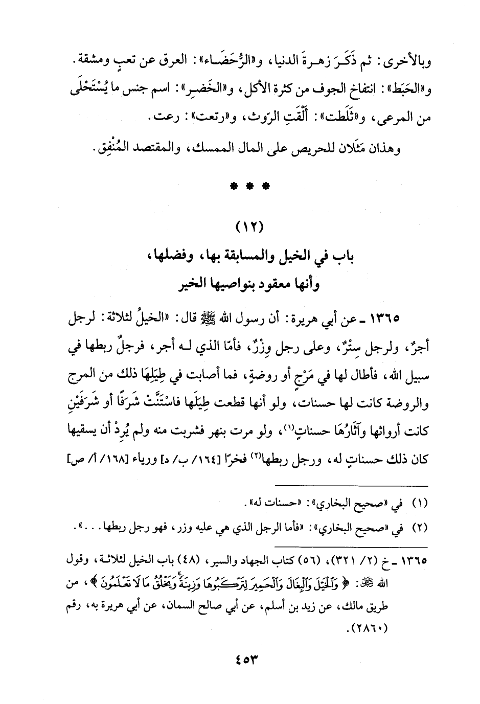 1365 - عن أبي هريرة: أن رسول اللَّه -صلى اللَّه عليه وسلم- قال: "الخيلُ لثلاثة: لرجل أجرٌ، ولرجل سِتْرٌ، وعلى رجل وِزْرٌ، فأمّا الذي له أجر، فرجلٌ ربطها في سبيل اللَّه، فأطال لها في مَرْجٍ أو روضةٍ، فما أصابت في طِيَلِهَا ذلك من المرج والروضة كانت لها حسنات، ولو أنها قطعت طِيَلَها فاسْتَنَّتْ شَرَفًا أو شَرَفَيْنِ كانت أرواثها وآثَارُهَا حسناتٍ (¬1)، ولو مرت بنهر فشربت منه ولم يُرِدْ أن يسقيها كان ذلك حسناتٍ له، ورجل ربطها (¬2) فخرًا ورياء