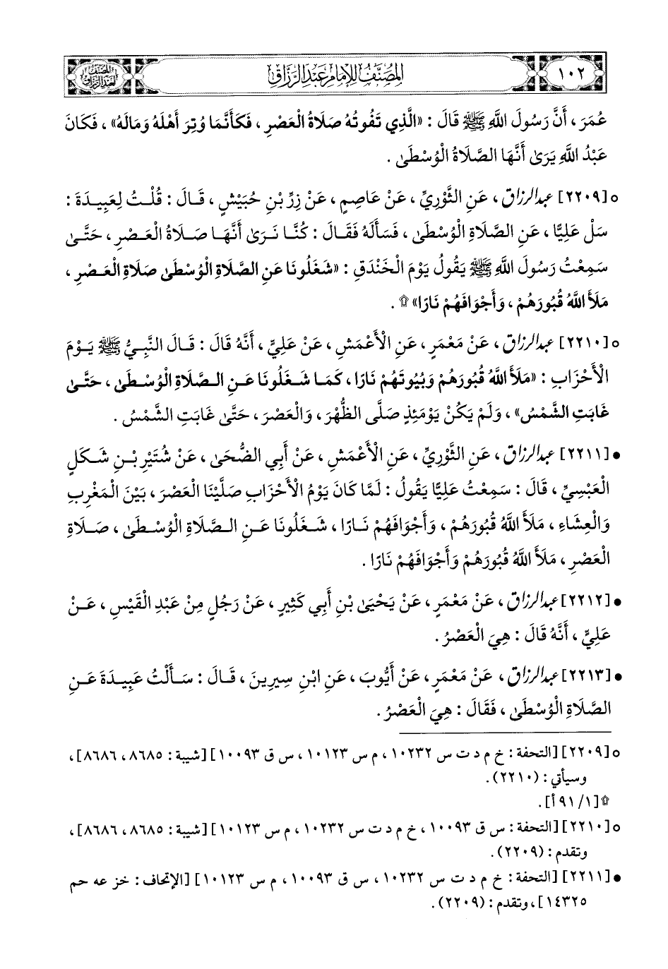 2209- عبد الرزاق، عَنِ الثَّورِيِّ، عَنْ عَاصِمٍ، عَن زِرِّ بْنِ حُبَيْشٍ، قَالَ: قُلْتُ لِعَبِيدَةَ: سَلْ عَلِيًّا عَنِ الصَّلاَةِ الْوُسْطَى، فَسَأَلَهُ، فَقَالَ: كُنَّا نَرَى أَنَّهَا صَلاَةُ الْعَصْرِ، حَتَّى سَمِعْتُ رَسُولَ اللهِ صَلَّى اللهُ عَلَيْهِ وَسَلَّمَ يَقُولُ يَوْمَ الْخَنْدَقِ: شَغَلُونَا عَنِ الصَّلاَةِ الْوُسْطَى صَلاَةِ الْعَصْرِ، مَلأَ اللهُ قُبُورَهُمْ وَأَجْوَافَهُمْ نَارًا.