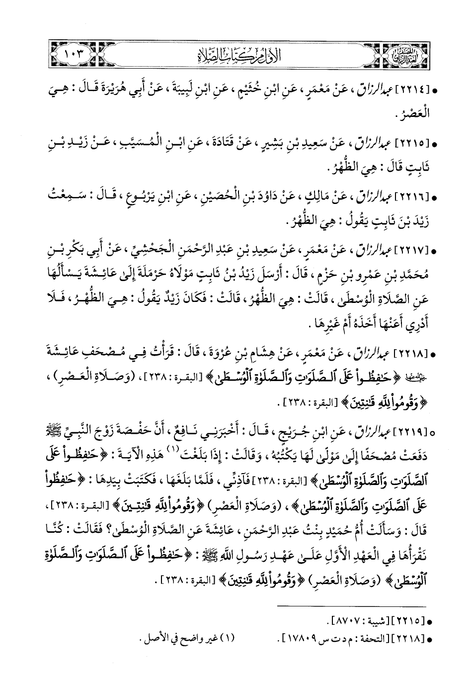 2219- عبد الرزاق، عَنِ ابْنِ جُرَيْجٍ، قَالَ: أَخْبَرَنِي نَافِعٌ، أَنَّ حَفْصَةَ زَوْجَ النَّبِيِّ صَلَّى اللهُ عَلَيْهِ وَسَلَّمَ دَفَعَتْ مُصْحَفًا إِلَى مَوْلًى لَهَا يَكْتُبُهُ، وَقَالَتْ: إِذَا بَلَغْتَ هَذِهِ الآيَةَ: {حَافِظُوا عَلَى الصَّلَوَاتِ وَالصَّلاَةِ الْوُسْطَى} فَآذِنِّي، فَلَمَّا بَلَغَهَا، فَكَتَبَتْ بِيَدِهَا: {حَافِظُوا عَلَى الصَّلَوَاتِ وَالصَّلاَةِ الْوُسْطَى} وَصَلاَةِ الْعَصْرِ {وَقُومُوا للهِ قَانِتِينَ}.