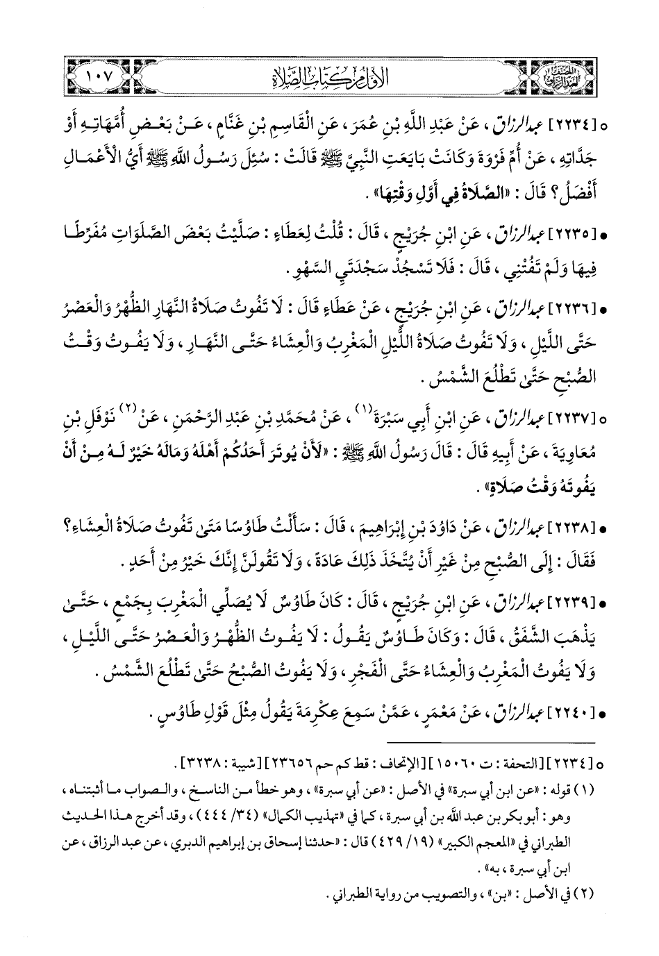 2237- عبد الرزاق، عَنِ ابْنِ أَبِي سَبْرَةَ، عَن مُحَمَّدِ بْنِ عَبدِ الرَّحْمَنِ، عَن نَوْفَلِ بْنِ مُعَاوِيَةَ، عَنْ أَبِيهِ، قَالَ: قَالَ رَسُولُ اللهِ صَلَّى اللهُ عَلَيْهِ وَسَلَّمَ: لأَنْ يُوتَرَ أَحَدُكُمْ أَهْلَهُ وَمَالَهُ خَيْرٌ لَهُ مِنْ أَنْ يَفُوتَهُ وَقْتُ صَلاَةٍ.