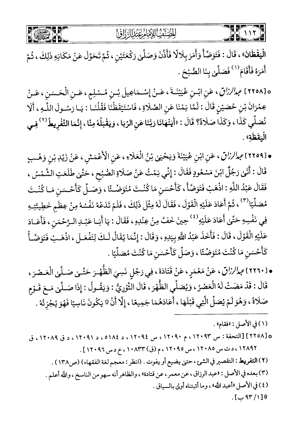 2259- عبد الرزاق، عَنِ ابْنِ عُيَيْنَةَ، وَيَحيَى بنِ الْعَلاَءِ، عَنِ الأَعمَشِ، عَن زَيْدِ بْنِ وَهْبٍ، قَالَ: أَتَى رَجُلٌ ابْنَ مَسْعُودٍ، فَقَالَ: إِنِّي نِمْتُ عَن صَلاَةِ الصُّبْحِ، حَتَّى طَلَعَتِ الشَّمْسُ فَقَالَ عَبدُ اللهِ: اذْهَبْ فَتَوَضَّأْ، كَأَحْسَنِ مَا كَنْتَ مُتَوَضِّئًا، وَصَلِّ كَأَحْسَنِ مَا كُنْتَ مُصَلِّيًا....، ثُمَّ أَعَادَ عَلَيْهِ الْقَوْلَ، فَقَالَ لَهُ مِثْلَ ذَلِكَ، فَلَمْ تَدَعْهُ نَفْسُهُ مِنْ عِظَمِ خَطِيئَتِهِ فِي نَفْسِهِ حَتَّى أَعَادَ عَلَيْهِ حِينَ خَفَّ مِنْ عِنْدِهِ، فَقَالَ: يَا أَبَا عَبدِ الرَّحْمَنِ فَأَعَادَ عَلَيْهِ الْقَوْلَ قَالَ: فَأَخَذَ عَبدُ اللهِ بِيَدِهِ وَقَالَ: إِنَّمَا يُقَالُ لَكَ لِتَفْعَلَ، اذْهَبْ فَتَوَضَّأْ كَأَحْسَنِ مَا كُنْتَ مُتَوَضِّئًا، وَصَلِّ كَأَحْسَنِ مَا كُنْتَ مُصَلِّيًا.