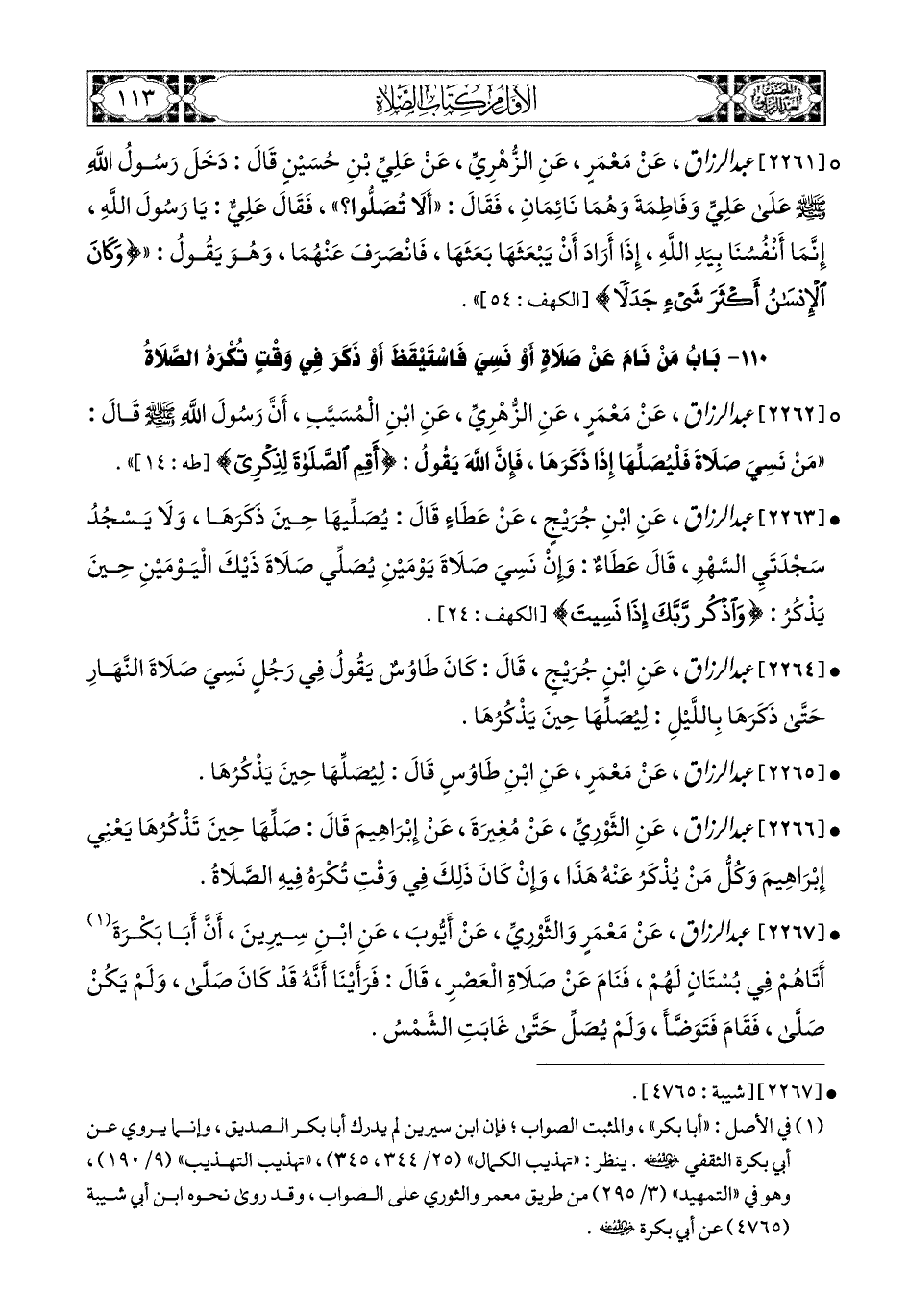 2261- عبد الرزاق، عَنْ مَعْمَرٍ، عَنِ الزُّهْرِيِّ، عَنْ عَلِيِّ بْنِ حُسَيْنٍ قَالَ: دَخَلَ رَسُولُ اللهِ صَلَّى اللهُ عَلَيْهِ وَسَلَّمَ عَلَى عَلِيٍّ وَفَاطِمَةَ وَهُمَا نَائِمَانِ، فَقَالَ: أَلاَ تُصَلُّوا؟ فَقَالَ عَلِيٌّ: يَا رَسُولَ اللهِ، إِنَّمَا أَنْفُسُنَا بِيَدِ اللهِ، إِذَا أَرَادَ أَنْ يَبْعَثَهَا بَعَثَهَا فَانْصَرَفَ عَنْهُمَا، وَهُوَ يَقُولُ: {وَكَانَ الإِنْسَانُ أَكْثَرَ شَيْءٍ جَدَلاً}.