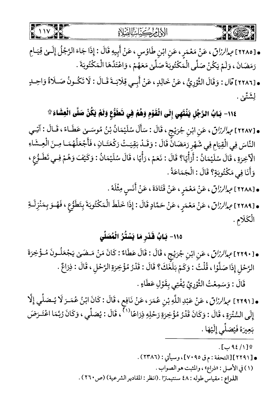 2290- عبد الرزاق، عَنِ ابْنِ جُرَيْجٍ، قَالَ: قَالَ عَطَاءٌ: كَانَ مَنْ مَضَى يَجْعَلُونَ مُؤْخِرَةَ الرَّحْلِ إِذَا صَلَّوْا، قُلْتُ: وَكَمْ بَلَغَكَ؟ قَالَ: قَدْرُ مُؤْخِرَةِ الرَّحْلِ، قَالَ: ذِرَاعٌ.
