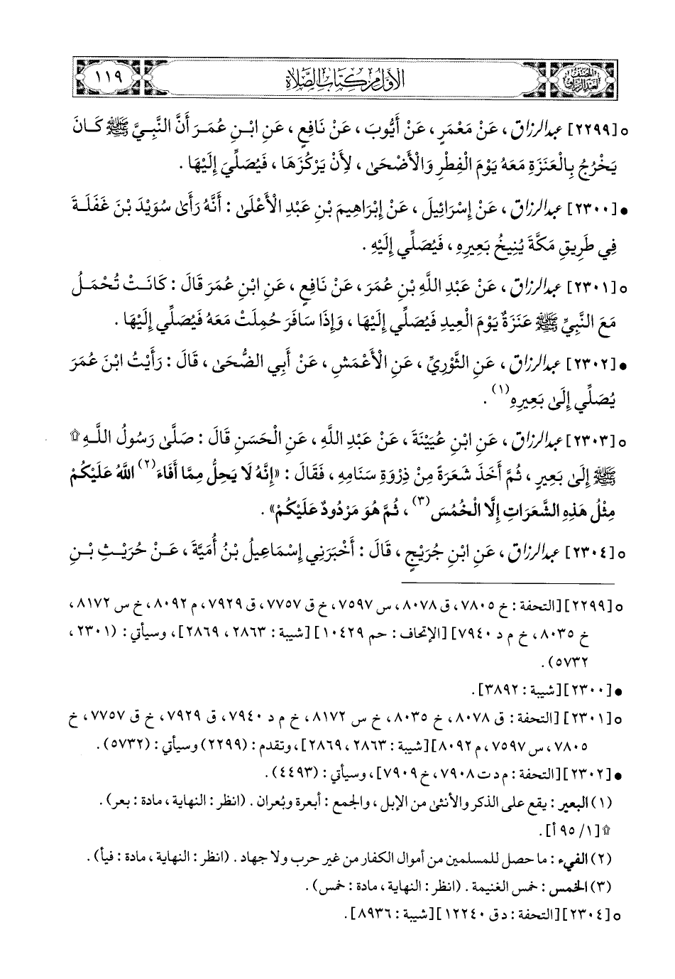 2301- عبد الرزاق، عَنْ عَبدِ اللهِ بْنِ عُمَرَ، عَن نَافِعٍ، عَنِ ابْنِ عُمَرَ، قَالَ: كَانَتْ تُحْمَلُ مَعَ النَّبِيِّ صَلَّى اللهُ عَلَيْهِ وَسَلَّمَ عَنَزَةٌ يَوْمَ الْعِيدِ، فَيُصَلِّيَ إِلَيْهَا، وَإِذَا سَافَرَ حُمِلَتْ مَعَهُ، فَيُصَلِّيَ إِلَيْهَا.