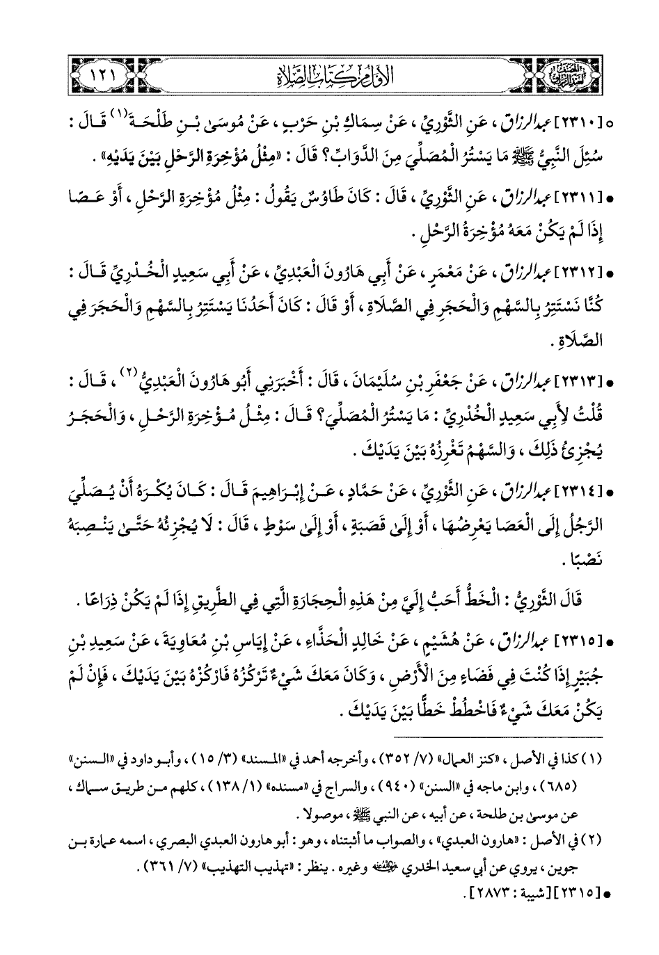 2310- عبد الرزاق، عَنِ الثَّورِيِّ، عَن سِمَاكِ بْنِ حَرْبٍ، عَن مُوسَى بنِ طَلْحَةَ قَالَ: سُئِلَ النَّبِيُّ صَلَّى اللهُ عَلَيْهِ وَسَلَّمَ: مَا يَسْتُرُ المُصَلِّي مِنَ الدَّوَابِّ؟ قَالَ: مِثْلُ مُؤْخِرَةِ الرَّحْلِ بَيْنَ يَدَيْهِ.