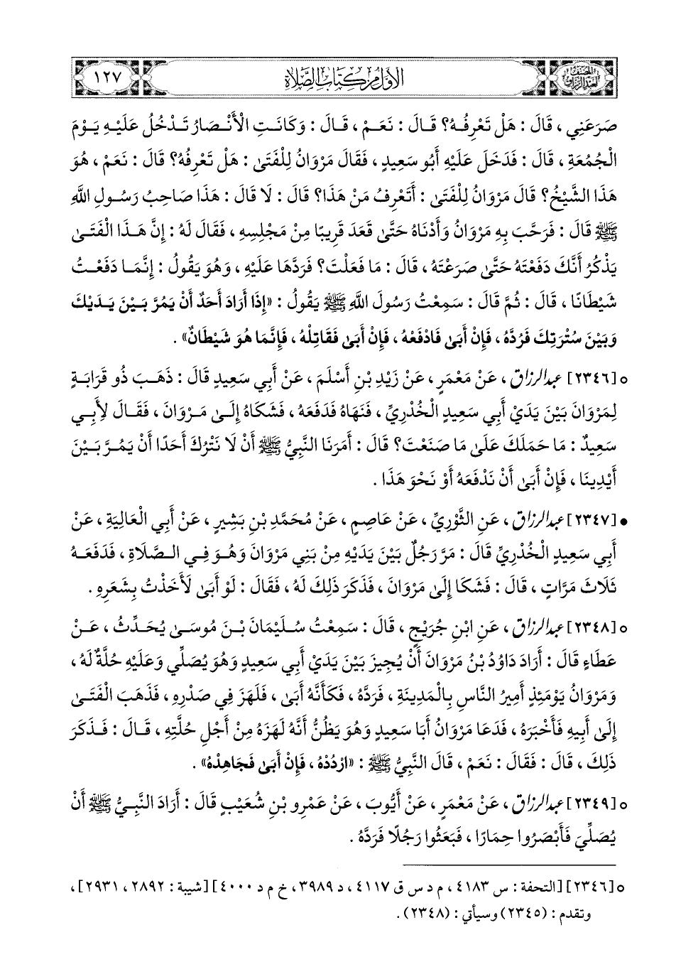 2348- عبد الرزاق، عَنِ ابْنِ جُرَيْجٍ، قَالَ: سَمِعْتُ سُلَيْمَانَ بن مُوسَى يُحَدِّثُ، عَنْ عَطَاءٍ، قَالَ: أَرَادَ دَاوُدُ بن مَرْوَانَ أَنْ يُجِيزَ بَيْنَ يَدَيْ أَبِي سَعيدٍ، وَهُوَ يُصَلِّي وَعَلَيْهِ حُلَّةٌ لَهُ، وَمَرْوَانُ يَوْمَئِذٍ أَمِيرُ النَّاسِ بِالمَدِينَةِ، فَرَدَّهُ، فَكَأَنَّهُ أَبَى، فَلَهَزَ فِي صَدْرِهِ، فَذَهَبَ الْفَتَى إِلَى أَبِيهِ فَأَخْبَرَهُ، فَدَعَا مَرْوَانُ أَبَا سَعيدٍ، وَهُوَ يَظُنُّ أَنَّهُ لَهَزَهُ مِنْ أَجْلِ حُلَّتِهِ، قَالَ: فَذَكَرَ ذَلِكَ، قَالَ: فَقَالَ: نَعَمْ، قَالَ النَّبِيُّ صَلَّى اللهُ عَلَيْهِ وَسَلَّمَ: ارْدُدْهُ، فَإِنْ أَبَى فَجَاهِدْهُ.