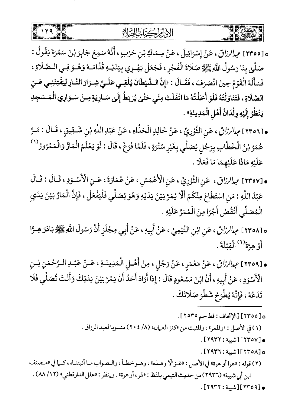 2357- عبد الرزاق، عَنِ الثَّورِيِّ، عَنِ الأَعمَشِ، عَن عُمَارَةَ، عَنِ الأَسْوَدِ قَالَ: قَالَ عَبدُ اللهِ: مَنِ اسْتَطَاعَ مِنْكُمْ أَنْ لاَ يَمُرَّ بَيْنَ يَدَيْهِ وَهُوَ يُصَلِّي فَلْيَفْعَلْ، فَإِنَّ المَارَّ بَيْنَ يَدَيِ المُصِلِّي أَنْقَصُ أَجْرًا مِنَ المُمَرِّ عَلَيْهِ.