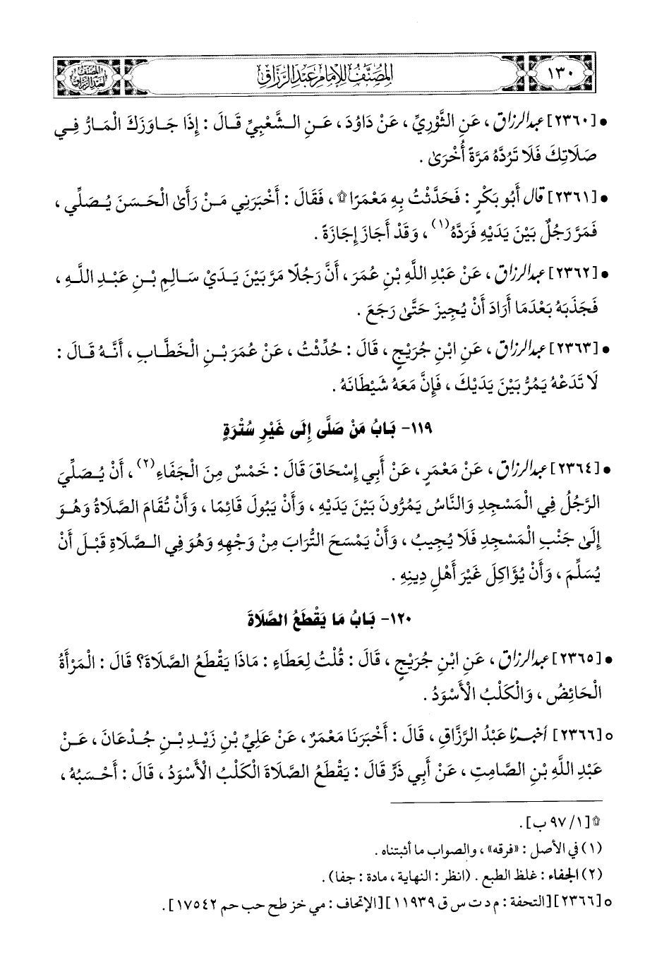 2365- عبد الرزاق، عَنِ ابْنِ جُرَيْجٍ، قَالَ: قُلْتُ لِعَطَاءٍ: مَاذَا يَقْطَعُ الصَّلاَةَ؟ قَالَ: المَرْأَةُ الْحَائِضُ، وَالْكَلْبُ الأَسْوَدُ.