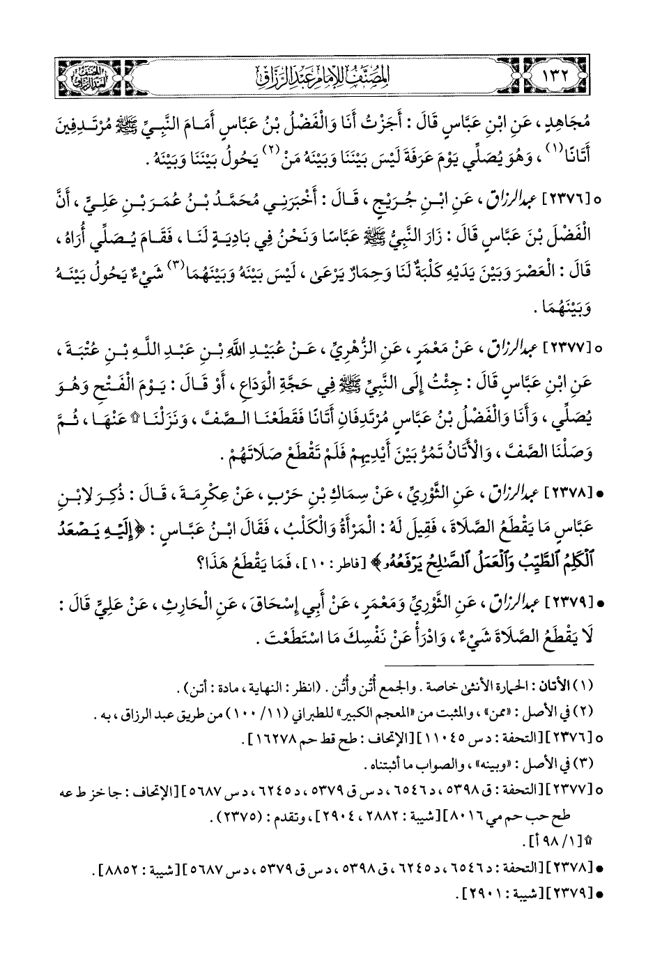 2377- عبد الرزاق، عَنْ مَعْمَرٍ، عَنِ الزُّهْرِيِّ، عَن عُبَيْدِ اللهِ بْنِ عَبدِ اللهِ بْنِ عُتْبَةَ، عَنِ ابْنِ عَبَّاسٍ، قَالَ: جِئْتُ إِلَى النَّبِيِّ صَلَّى اللهُ عَلَيْهِ وَسَلَّمَ فِي حَجَّةِ الْوَدَاعِ، أَوْ قَالَ: يَوْمَ الْفَتْحِ، وَهُوَ يُصَلِّي، وَأَنَا وَالْفَضْلُ بن عَبَّاسٍ مُرْتَدِفَانِ أَتَانًا، فَقَطَعْنَا الصَّفَّ، وَنَزَلْنَا عَنْهَا، ثُمَّ وَصَلْنَا الصَّفَّ، وَالأَتَانُ تَمُرُّ بَيْنَ أَيْدِيهِمْ، فَلَمْ تَقْطَعْ صَلاَتَهُمْ.