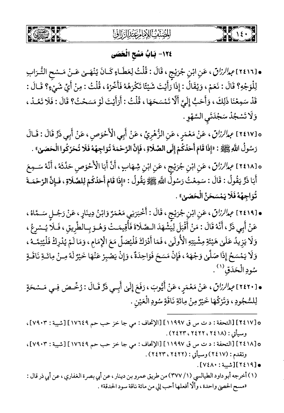 2418- عبد الرزاق، عَنِ ابْنِ جُرَيْجٍ، عَنِ ابْنِ شِهَابٍ، أَنَّ أَبَا الأَحْوَصِ حَدَّثَهُ، أَنَّهُ سَمِعَ أَبَا ذَرٍّ يَقُولُ: قَالَ: سَمِعْتُ رَسُولَ اللهِ صَلَّى اللهُ عَلَيْهِ وَسَلَّمَ يَقُولُ: إِذَا قَامَ أَحَدُكُمْ لِلصَّلاَةِ فَإِنَّ الرَّحْمَةَ تُوَاجِهُهُ، فَلاَ يَمْسَحَنَّ الْحَصَى.