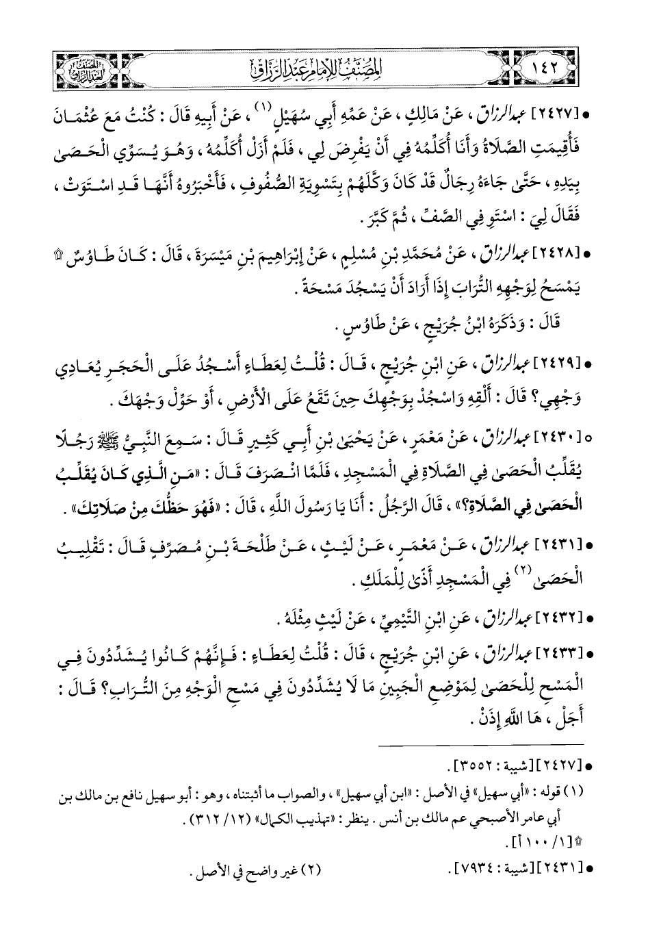 2427- عبد الرزاق، عَنْ مَالِكٍ، عَنْ عَمِّهِ أَبِي سُهَيْلٍ، عَنْ أَبِيهِ، قَالَ: كُنْتُ مَعَ عُثْمَانَ، فَأقيمَتِ الصَّلاَةُ وَأَنَا أُكَلِّمُهُ فِي أَنْ يَفْرِضَ لِي، فَلَمْ أَزَلْ أُكَلِّمُهُ، وَهُوَ يُسَوِّي الْحَصَى بِيَدِهِ، حَتَّى جَاءَهُ رِجَالٌ قَدْ كَانَ وَكَّلَهُمْ بِتَسْوِيَةِ الصُّفُوفِ، فَأَخْبَرُوهُ أَنَّهَا قَدِ اسْتَوَتْ، فَقَالَ لِي: اسْتَوِ فِي الصَّفِّ، ثُمَّ كَبِّرْ.
