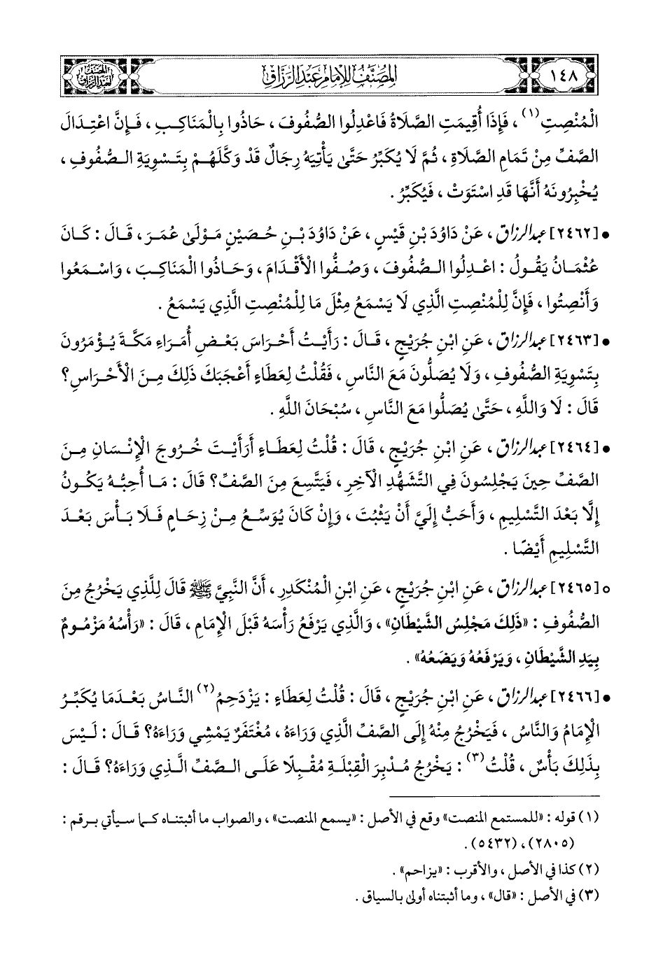 2465- عبد الرزاق، عَنِ ابْنِ جُرَيْجٍ، عَنِ ابْنِ المُنْكَدِرِ، أَنَّ النَّبِيَّ صَلَّى اللهُ عَلَيْهِ وَسَلَّمَ قَالَ لِلَّذِي يَخْرُجُ مِنَ الصُّفُوفِ: ذَلِكَ مَجْلِسُ الشَّيْطَانِ، وَالَّذِي يَرْفَعُ رَأْسَهُ قَبْلَ الإِمَامِ، قَالَ: رَأْسُهُ مَزْمُومٌ بِيَدِ الشَّيْطَانِ، وَيَرْفَعُهُ وَيَضَعُهُ.