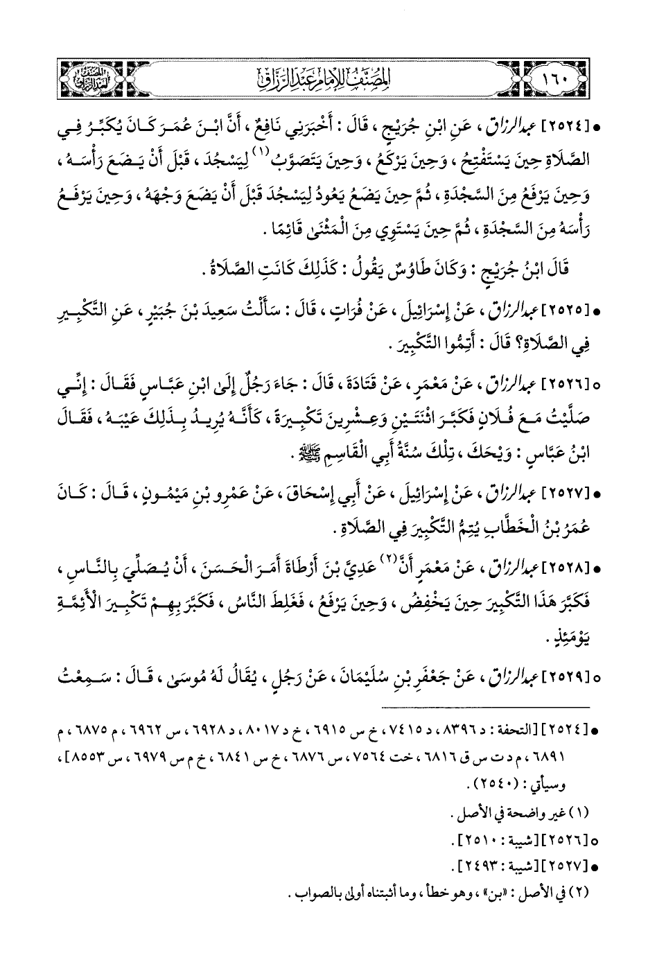 2525- عبد الرزاق، عَن إِسْرَائِيلَ، عَن فُرَاتٍ قَالَ: سَأَلْتُ سَعيدَ بن جُبَيرٍ عَنِ التَّكْبِيرِ فِي الصَّلاَةِ قَالَ: أَتِمُّوا التَّكْبِيرَ.