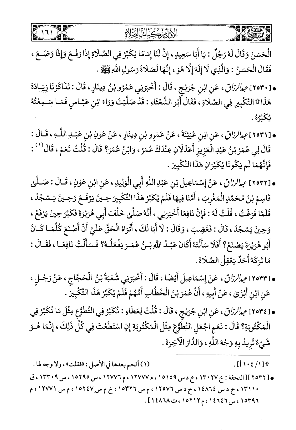 2530- عبد الرزاق، عَنِ ابْنِ جُرَيْجٍ، قَالَ: أَخْبَرَنِي عَمْرُو بن دِينَارٍ، قَالَ: تَذَاكَرْنَا زِيَادَةَ هَذَا التَّكْبِيرِ فِي الصَّلاَةِ، فَقَالَ أَبو الشَّعْثَاءِ: قَدْ صَلَّيْتُ وَرَاءَ ابْنِ عَبَّاسٍ، فَمَا سَمِعْتُهُ يُكَبِّرُهُ.