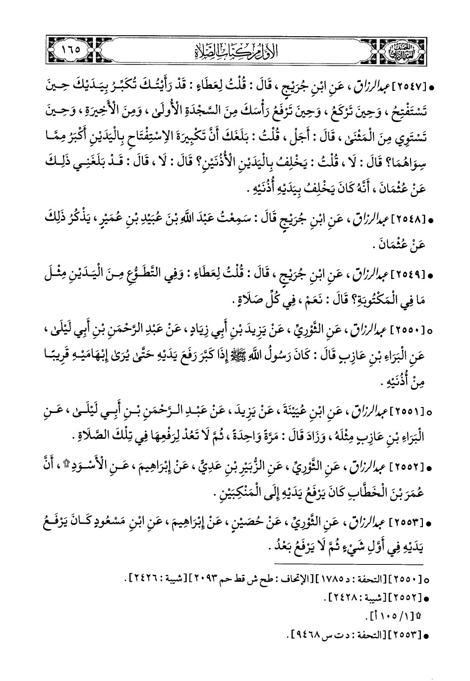 2547- عبد الرزاق، عَنِ ابْنِ جُرَيْجٍ، قَالَ: قُلْتُ لِعَطَاءٍ: قَدْ رَأَيْتُكَ تُكَبِّرُ بِيَدِيكَ حِينَ تَسْتَفْتِحُ، وَحِينَ تَرْكَعُ، وَحِينَ تَرْفَعُ رَأْسَكَ مِنَ السَّجْدَةِ الأُولَى، وَمِنَ الأَخِيرَةِ، وَحِينَ تَسْتَوِي مِنَ المَثْنَى، قَالَ: أَجَلْ، قُلْتُ: بَلَغَكَ أَنَّ تَكْبِيرة الاِسْتِفْتَاحِ بِالْيَدَيْنِ أَكْبَرُ مِمِّا سِوَاهُمَا؟ قَالَ: لاَ، قُلْتُ: يَخْلِفُ بِالْيَدَيْنِ الأُذُنَيْنِ؟ قَالَ: لاَ، قَالَ: قَدْ بَلَغَنِي ذَلِكَ عَن عُثْمَانَ، أَنَّهُ كَانَ يَخْلِفُ بِيَدَيْهِ أُذُنَيْهِ.