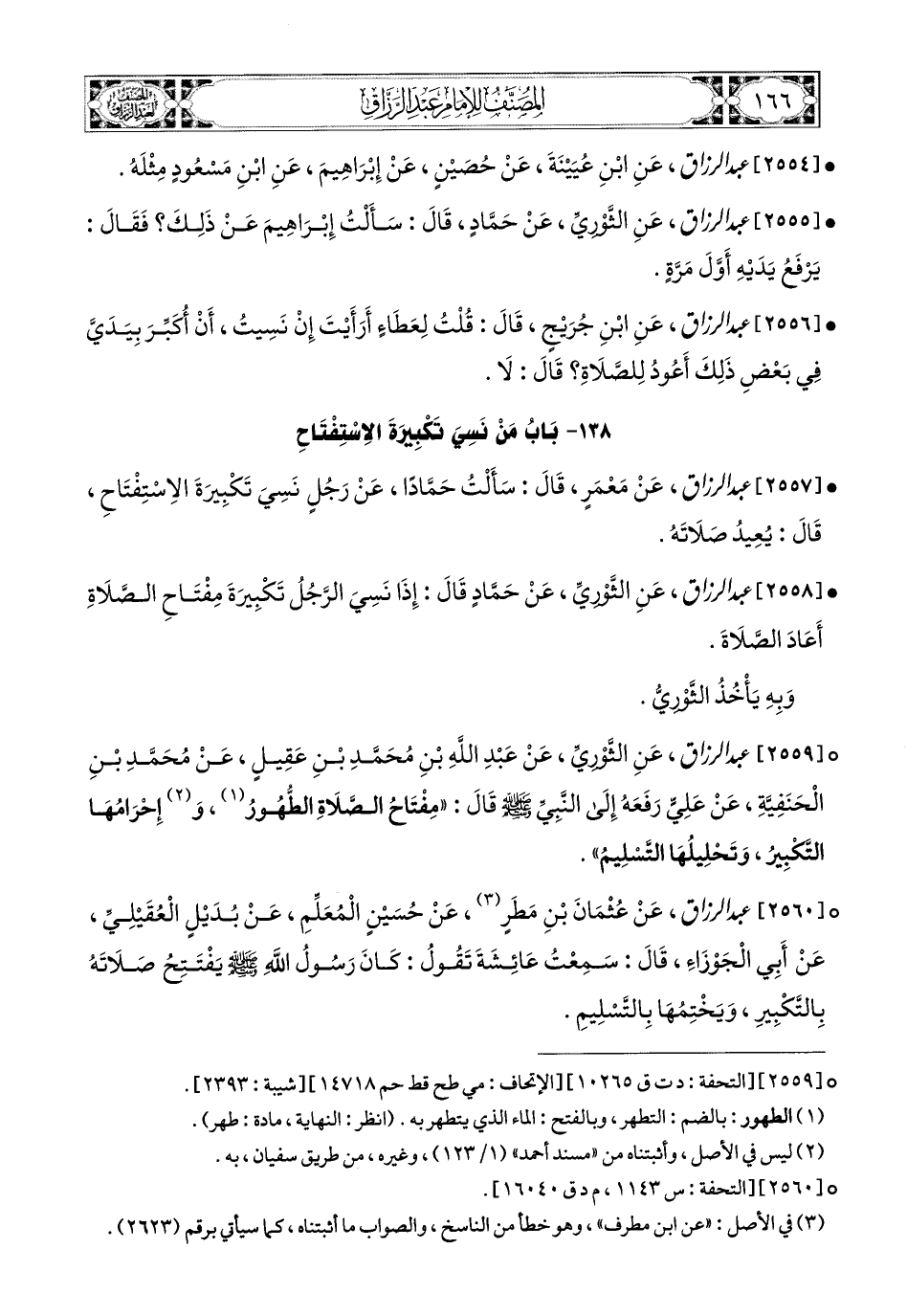 2557- عبد الرزاق، عَنْ مَعْمَرٍ، قَالَ: سَأَلْتُ حَمَّادًا عَن رَجُلٍ نَسِيَ تَكْبِيرَةَ الاِسْتِفْتَاحِ قَالَ: يُعِيدُ صَلاَتَهُ.