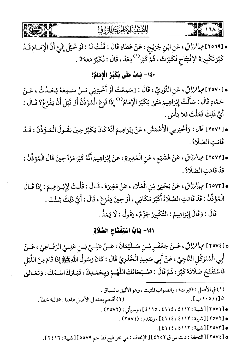 2570- عبد الرزاق، عَنِ الثَّورِيِّ، قَالَ: وَسَمِعْتُ، أَوْ أَخْبَرَنِي مَنْ سَمِعَهُ يُحَدِّثُ عَن حَمَّادٍ، قَالَ: سَأَلْتُ إِبرَاهِيمَ: مَتَى يُكَبِّرُ الإِمَامُ؟ إِذَا فَرَغَ المُؤَذِّنُ، أَوْ قَبْلَ أَنْ يَفْرُغَ؟ قَالَ: أَيُّ ذَلِكَ فَعَلْتَ فَلاَ بَأْسَ.