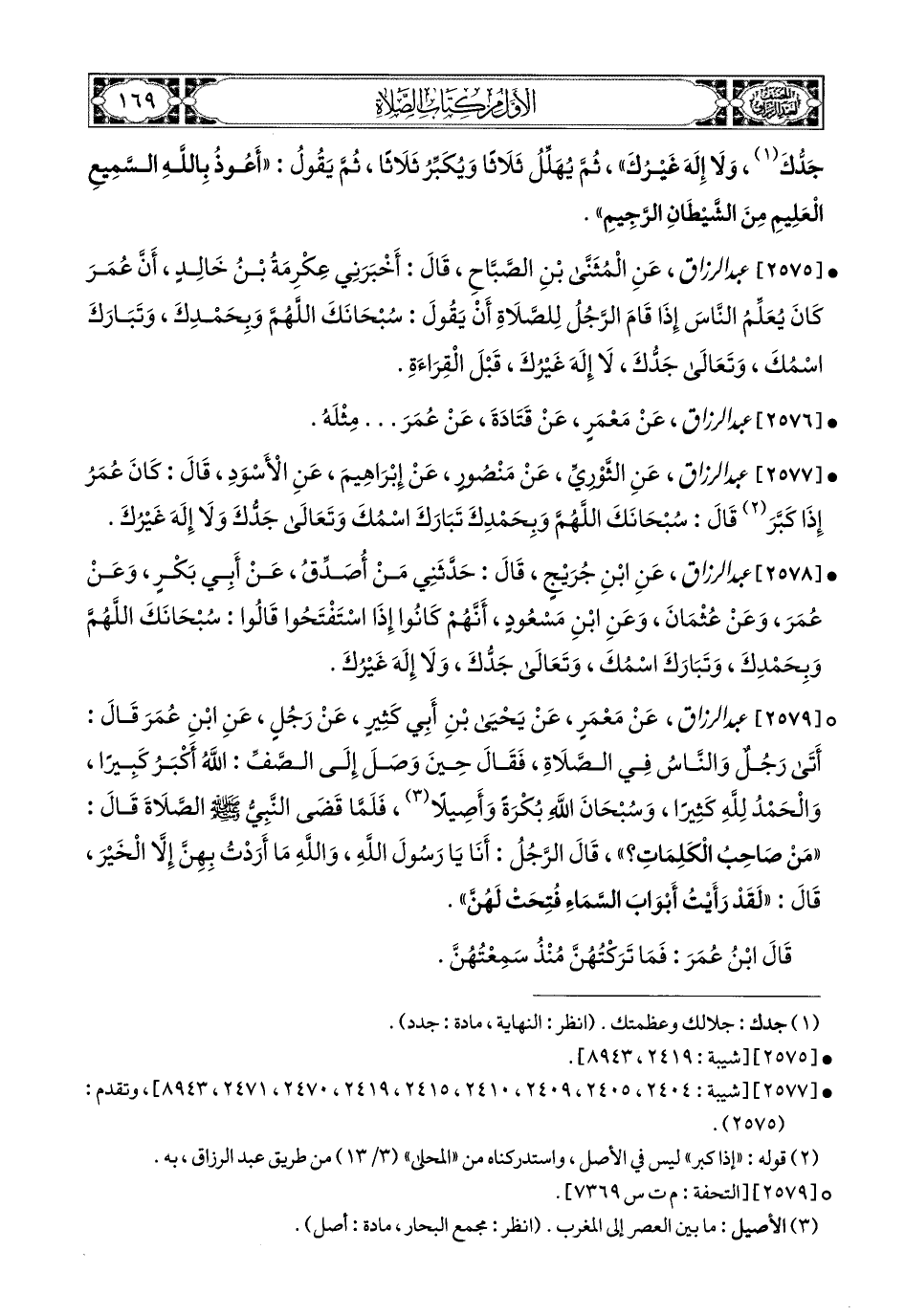 2577- عبد الرزاق، عَنِ الثَّورِيِّ، عَنْ مَنصُورٍ، عَن إِبرَاهِيمَ، عَنِ الأَسْوَدِ قَالَ: كَانَ عُمَرُ إِذَا كَبَّرَ قَالَ: سُبْحَانَكَ اللهُمَّ وَبِحَمْدِكَ، تَبَارَكَ اسْمُكَ، وَتَعَالَى جَدُّكَ، وَلاَ إِلَهَ غَيْرُكَ.