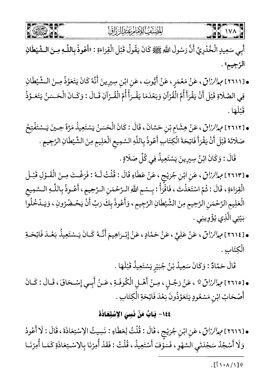 2612- عبد الرزاق، عَن هِشَامِ بْنِ حَسَّانَ، قَالَ: كَانَ الْحَسَنُ يَسْتَعِيذُ مَرَّةً حِينَ يَسْتَفْتِحُ صَلاَتَهُ قَبْلَ أَنْ يَقْرَأَ فَاتِحَةَ الْكِتَابِ: أَعُوذُ باللهِ السَّمِيعِ الْعَلِيمِ مِنَ الشَّيْطَانِ الرَّجِيمِ، قَالَ: وَكَانَ ابْنُ سِيرِينَ يَسْتَعِيذُ فِي كُلِّ صَلاَةٍ.