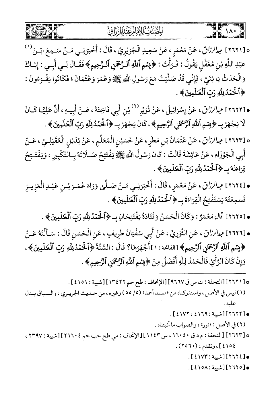 2626- عبد الرزاق، عَنِ الثَّورِيِّ، عَنْ أَبِي سُفِيَانَ، طَرِيف، عَنِ الْحَسَنِ قَالَ: سَأَلْتُهُ عَنْ: {بِسْمِ اللهِ الرَّحْمَنِ الرَّحِيمِ} أَجْهَرُهَا؟ قَالَ: السُّنَّةُ: {الْحَمْدُ للهِ رَبِّ الْعَالَمِينَ}، وَإِنْ كَانَ الرَّأْيُ فَالْحَمْدُ للهِ أَفْضَلُ مِنْ {بِسْمِ اللهِ الرَّحْمَنِ الرَّحِيمِ}.