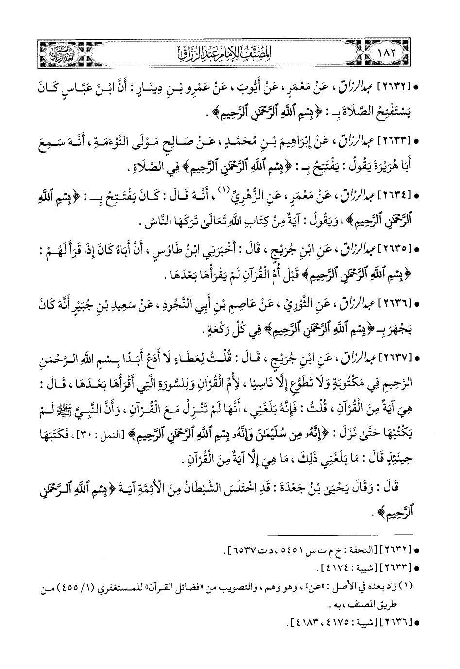 2637- عبد الرزاق، عَنِ ابْنِ جُرَيْجٍ، قَالَ: قُلْتُ لِعَطَاءٍ: لاَ أَدَعُ أَبَدًا: {بِسْمِ اللهِ الرَّحْمَنِ الرَّحِيمِ} فِي مَكْتُوبَةٍ وَلاَ تَطَوُّعٍ إِلاَّ نَاسِيًا، لأُمِّ الْقُرْآنِ وَلِلسُّورَةِ الَّتِي أَقْرَأُهَا بَعْدَهَا، قَالَ: هِيَ آيَةٌ مِنَ الْقُرْآنِ، قُلْتُ: فَإِنَّهُ بَلَغَنِي أَنَّهَا لَمْ تَنْزِلْ مَعَ الْقُرْآنِ، وَأَنَّ النَّبِيَّ صَلَّى اللهُ عَلَيْهِ وَسَلَّمَ لَمْ يَكْتُبْهَا، حَتَّى نَزَلَ: {إِنَّهُ مِنْ سُلَيْمَانَ وَإِنَّهُ بِسْمِ اللهِ الرَّحْمَنِ الرَّحِيمِ}، فَكَتَبَهَا حِينَئِذٍ، قَالَ: مَا بَلَغَنِي ذَلِكَ، مَا هِيَ إِلاَّ آيَةٌ مِنَ الْقُرْآنِ، قَالَ: وَقَالَ يَحيَى بن جَعْدَةَ: قَدِ اخْتَلَسَ الشَّيْطَانُ مِنَ الأَئِمَّةِ آيَةَ: {بِسْمِ اللهِ الرَّحْمَنِ الرَّحِيمِ}.