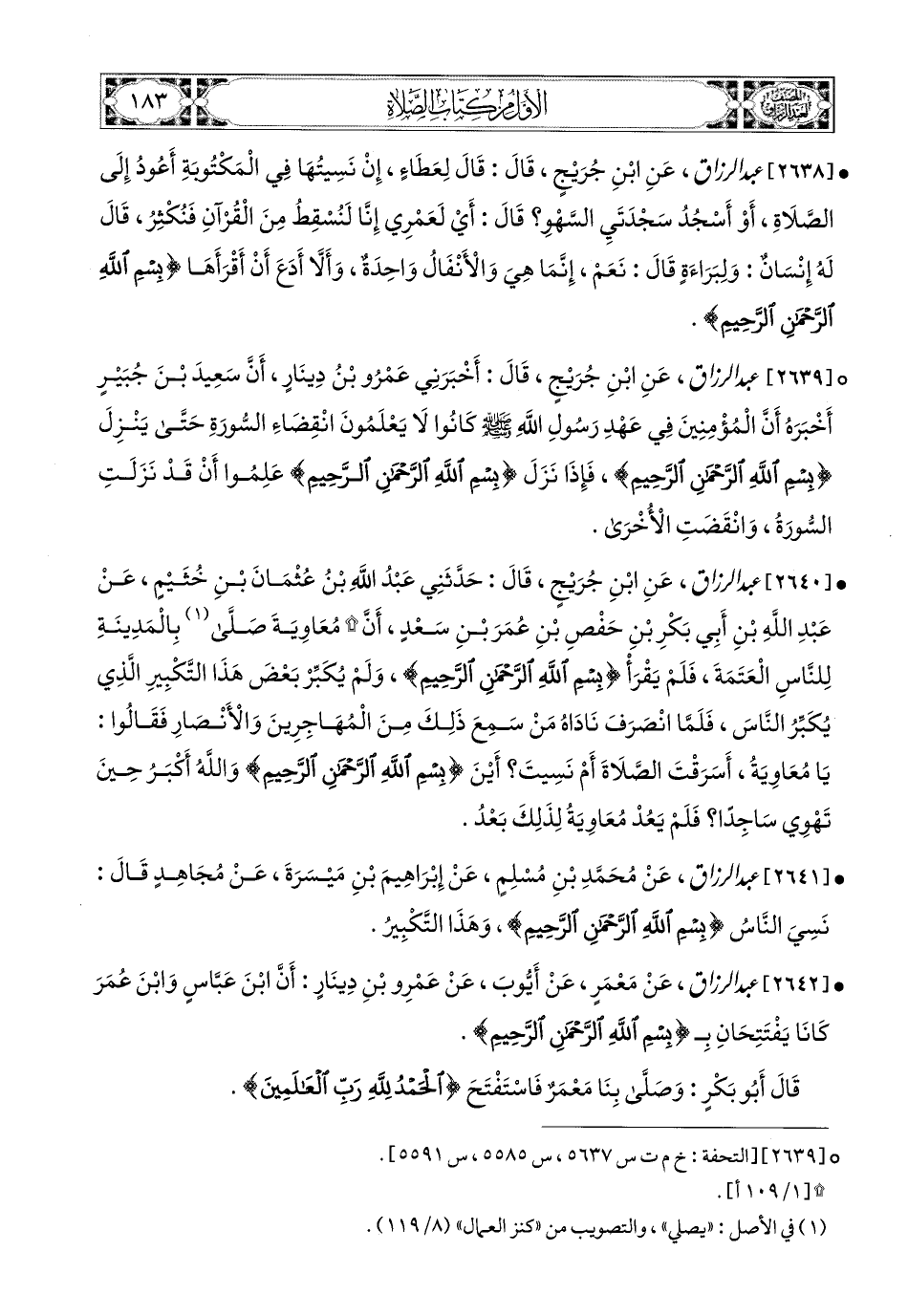 2638- عبد الرزاق، عَنِ ابْنِ جُرَيْجٍ، قَالَ: قَالَ لِعَطَاءٍ: إِنْ نَسِيتُهَا فِي المَكْتُوبَةِ، أَعُودُ إِلَى الصَّلاَةِ، أَوْ أَسْجُدُ سَجْدَتَيِ السَّهْوِ؟ قَالَ: أَيْ لَعَمْرِي إِنَّا لَنُسْقِطُ مِنَ الْقُرْآنِ فَنُكْثِرُ، قَالَ لَهُ إِنْسَانٌ: وَلبَرَاءَةُ، قَالَ: نَعَمْ، إِنَّمَا هِيَ وَالأَنْفَالُ وَاحِدَةٌ، وَأَلاَّ أَدَعُ أَنْ أَقْرَأَهَا: {بِسْمِ اللهِ الرَّحْمَنِ الرَّحِيمِ}.