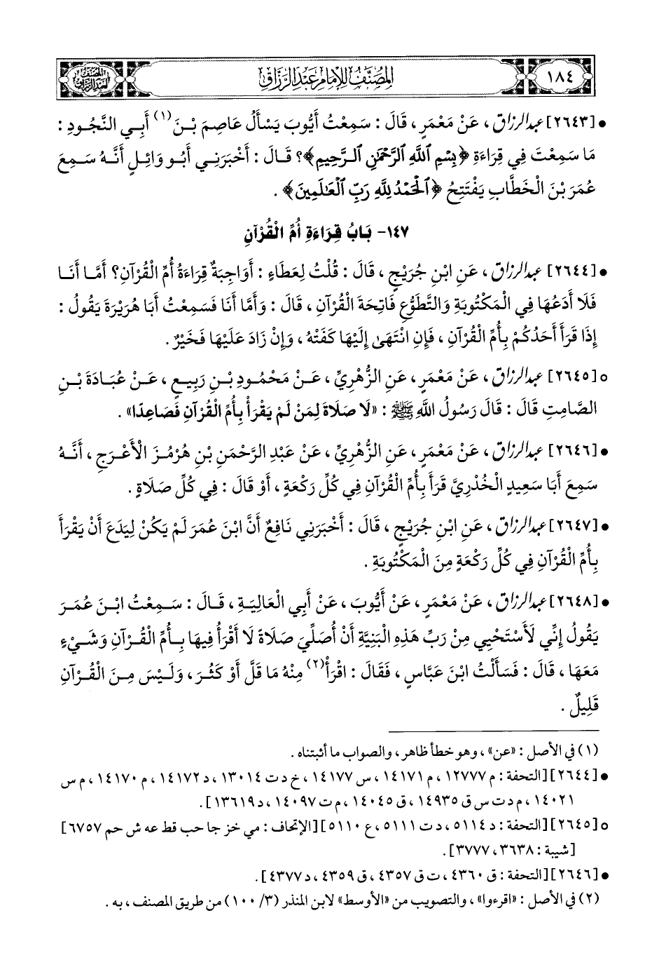 2643- عبد الرزاق، عَنْ مَعْمَرٍ، قَالَ: سَمِعْتُ أَيُّوبَ يَسْأَلُ عَاصِمَ بن أَبِي النَّجُودِ: مَا سَمِعْتَ فِي قِرَاءَةِ: بِسْمِ اللهِ الرَّحْمَنِ الرَّحِيمِ؟ قَالَ: أَخْبَرَنِي أَبو وَائِلٍ، أَنَّهُ سَمِعَ عُمَرَ بن الْخَطَّابِ يَفْتَتِحُ: {الْحَمْدُ للهِ رَبِّ الْعَالَمِينَ}.