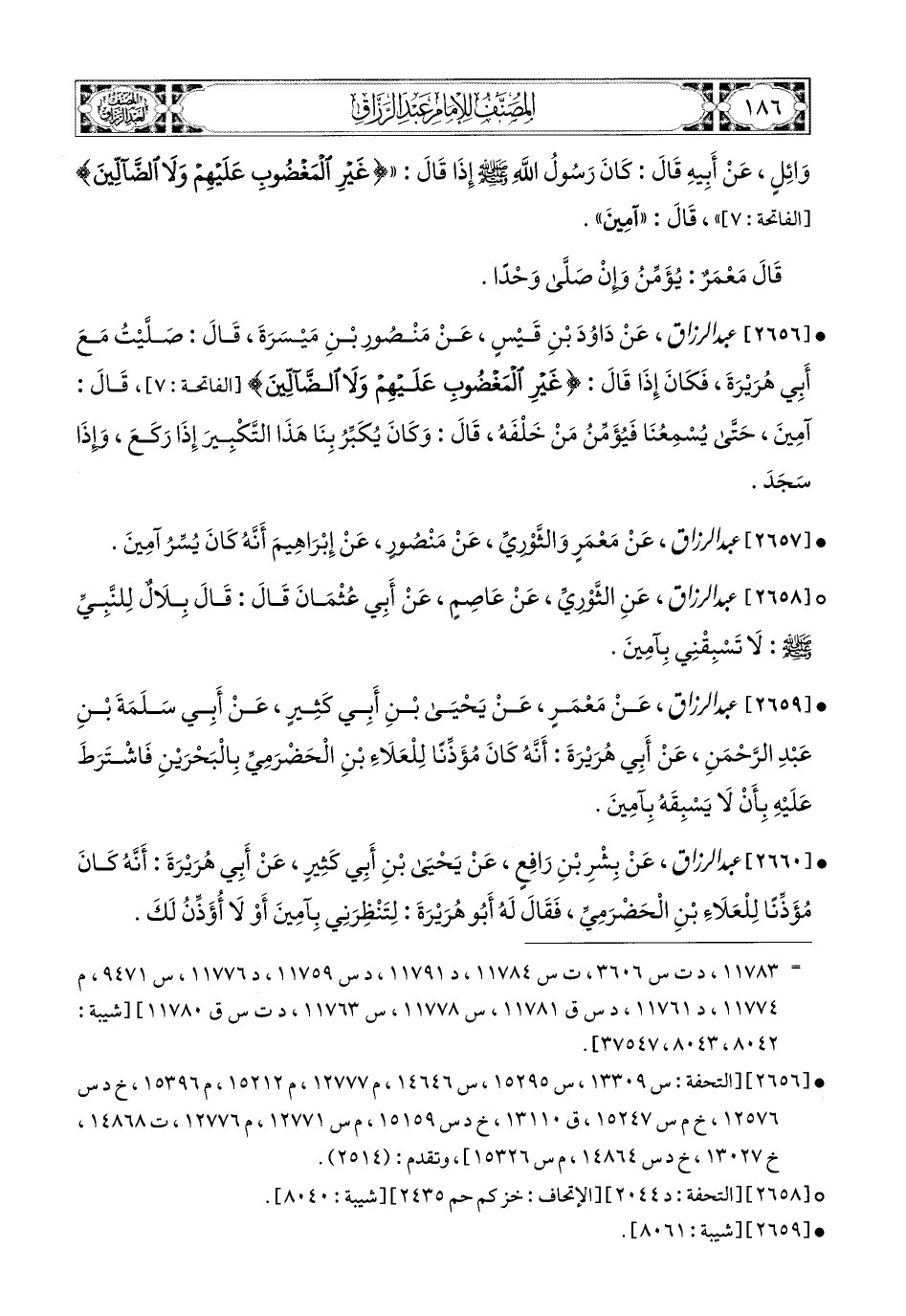 2659- عبد الرزاق، عَنْ مَعْمَرٍ، عَن يَحيَى بنِ أَبِي كَثِيرٍ، عَنْ أَبِي سَلَمَةَ بْنِ عَبدِ الرَّحْمَنِ، عَنْ أَبِي هُرَيرَةَ؛ أَنَّهُ كَانَ مُؤَذِّنًا لِلْعَلاَءِ بْنِ الْحَضْرَمِيِّ بِالْبَحْرَيْنِ، فَاشْتَرَطَ عَلَيْهِ بِأَنْ لاَ يَسْبِقَهُ بِآمِينَ.