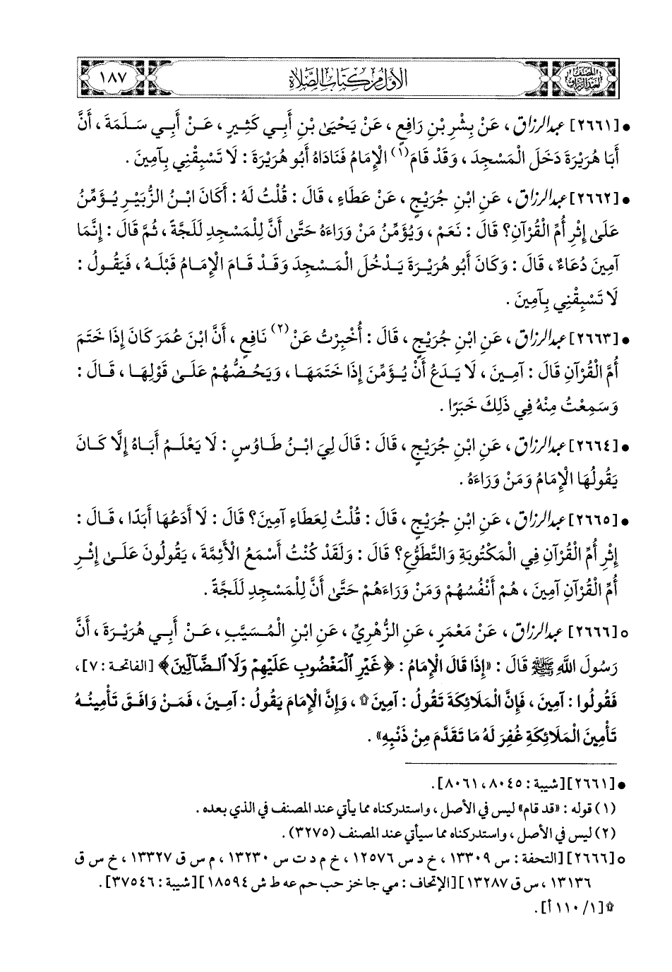 2666- عبد الرزاق، عَنْ مَعْمَرٍ، عَنِ الزُّهْرِيِّ، عَنِ ابْنِ المُسَيَّبِ، عَنْ أَبِي هُرَيرَةَ، أَنَّ رَسُولَ اللهِ صَلَّى اللهُ عَلَيْهِ وَسَلَّمَ قَالَ: إِذَا قَالَ الإِمَامُ: {غَيْرِ المَغْضُوبِ عَلَيْهِمْ وَلاَ الضَّالِّينَ} فَقُولُوا: آمِينَ، فَإِنَّ المَلاَئِكَةَ تَقُولُ: آمِينَ، وَإِنَّ الإِمَامَ يَقُولُ: آمِينَ، فَمَنْ وَافَقَ تَأْمِينُهُ تَأْمِينَ المَلاَئِكَةِ، غُفِرَ لَهُ مَا تَقَدَّمَ مِنْ ذَنْبِهِ.