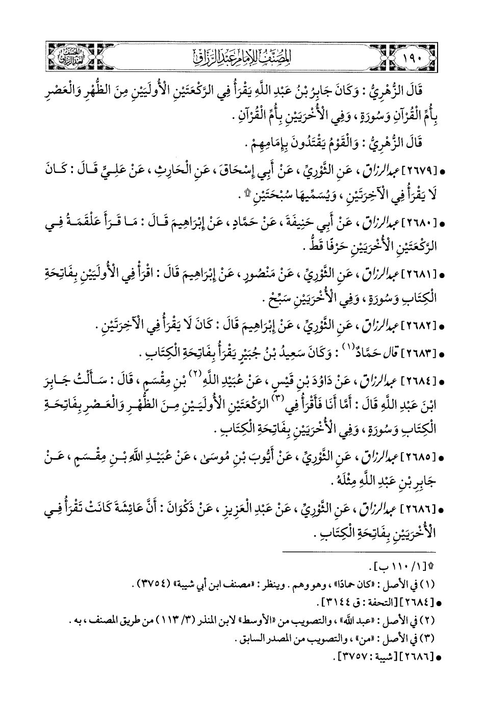 2684- عبد الرزاق، عَن دَاوُدَ بْنِ قَيْسٍ، عَن عُبَيْدِ اللهِ بْنِ مِقْسَمٍ قَالَ: سَأَلْتُ جَابِرَ بن عَبدِ اللهِ قَالَ: أَمَّا أَنَا فَأَقْرَأُ فِي الرَّكْعَتَيْنِ الأُولَيَيْنِ مِنَ الظُّهْرِ وَالْعَصْرِ بِفَاتِحَةِ الْكِتَابِ وَسُورَةٍ، وَفِي الأُخْرَيَيْنِ بِفَاتِحَةِ الْكِتَابِ.