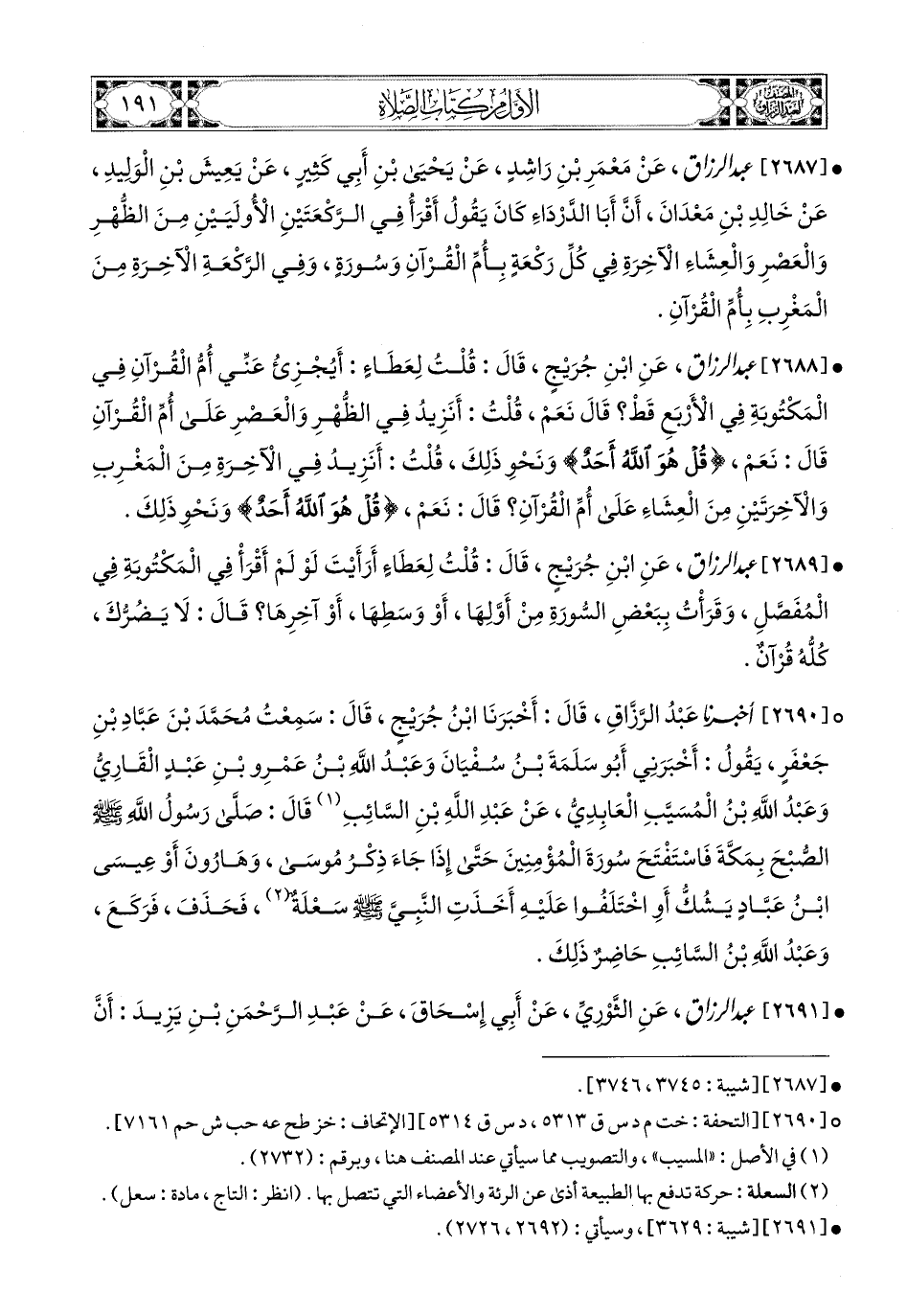 2687- عبد الرزاق، عَنْ مَعْمَرِ بْنِ رَاشِدٍ، عَن يَحيَى بنِ أَبِي كَثِيرٍ، عَن يَعِيشَ بْنِ الْوَلِيدِ، عَن خَالِدِ بْنِ مَعْدَانَ، أَنَّ أَبَا الدَّرْدَاءِ كَانَ يَقُولُ: أَقْرَأُ فِي الرَّكْعَتَيْنِ الأُولَيَيْنِ مِنَ الظُّهْرِ وَالْعَصْرِ وَالْعِشَاءِ الآخِرَةِ فِي كُلِّ رَكْعَةٍ بِأُمِّ الْقُرْآنِ وَسُورَةٍ، وَفِي الرَّكْعَةِ الآخِرَةِ مِنَ المَغْرِبِ بِأُمِّ الْقُرْآنِ.