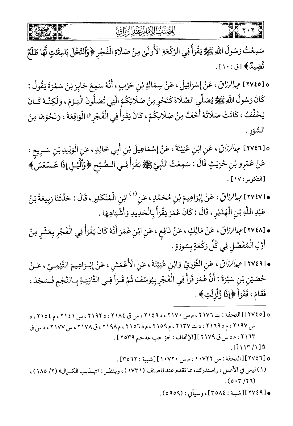 2749- عبد الرزاق، عَنِ الثَّورِيِّ، وَابْنِ عُيَيْنَةَ، عَنِ الأَعمَشِ، عَن إِبرَاهِيمَ التَّيْمِيِّ، عَن حُصَيْنِ بْنِ سَبْرَةَ؛ أَنَّ عُمَرَ قَرَأَ فِي الْفَجْرِ بِيُوسُفَ، ثُمَّ قَرَأَ فِي الثَّانِيَةِ بِالنَّجْمِ، فَسَجَدَ، فَقَامَ، فَقَرَأَ: {إِذَا زُلْزِلَتِ}.